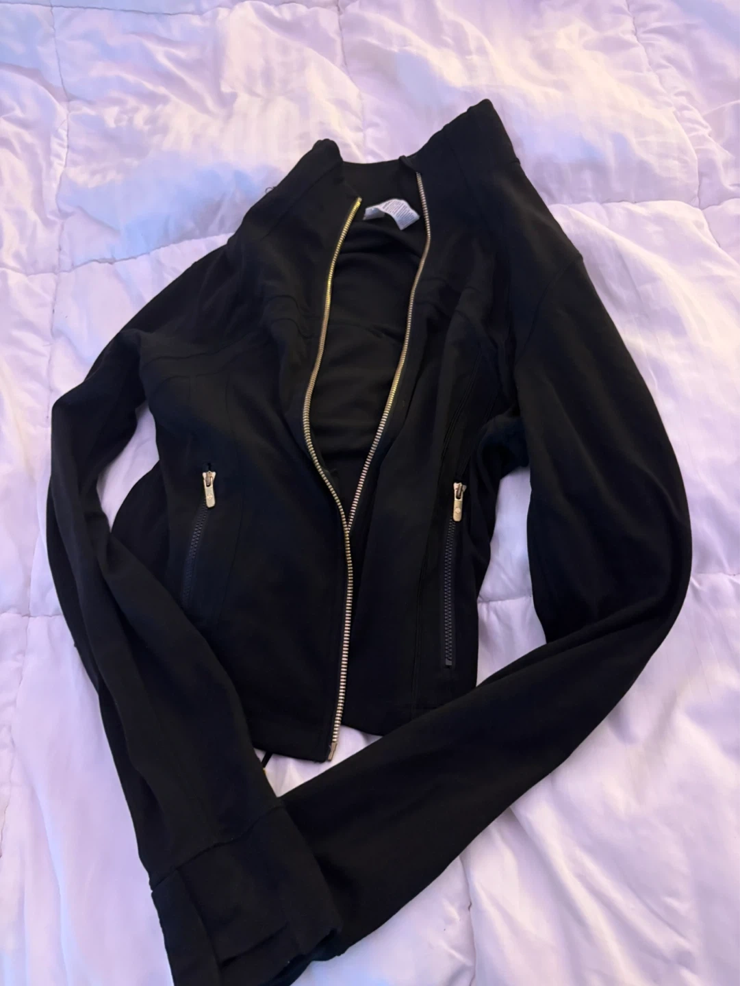 Lululemon black zip-up jacket. Body is 81% Nylon and 19% Lycra, lining is 56% Polyester and 11% Coolmax Polyester. It's designed in Vancouver.