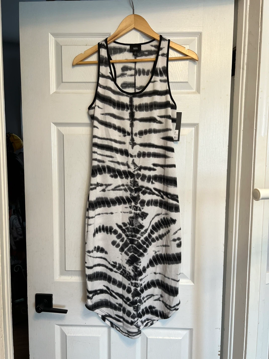 This is a women's Mossimo tank dress with a black and white tie-dye pattern. It's a size S/P. The dress has a scooped neckline and a racerback style.