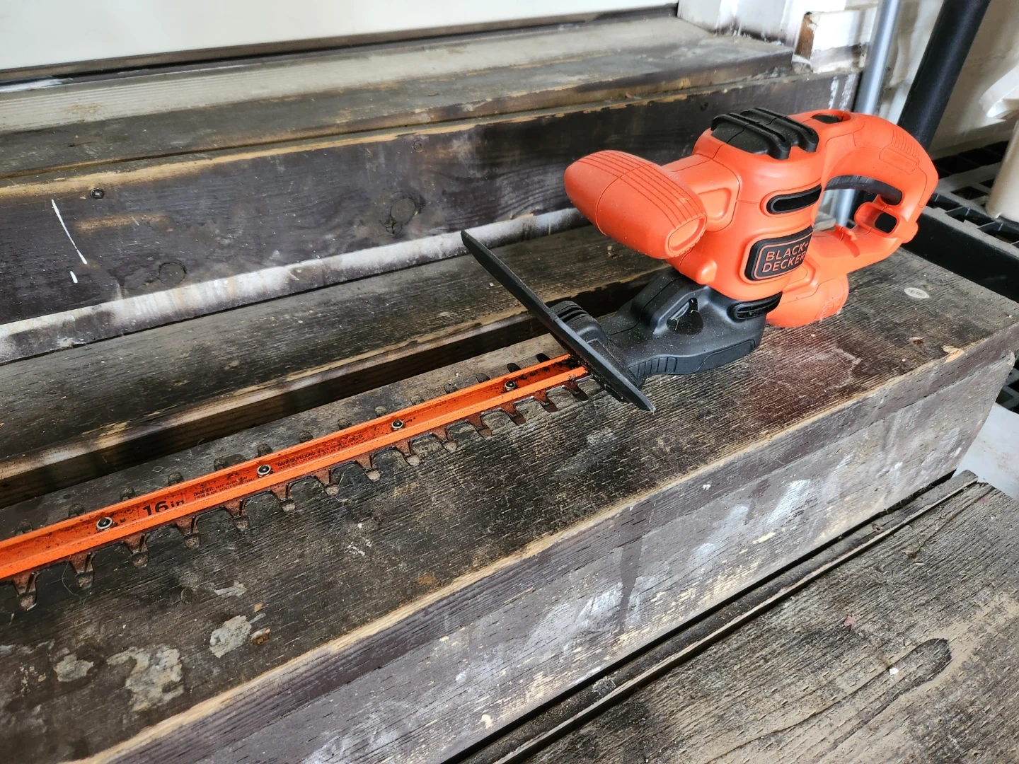 This is a Black+Decker hedge trimmer with a 16-inch blade. It's orange and black. Use it for trimming hedges and small branches. In absolutely great condition. Used for one season.