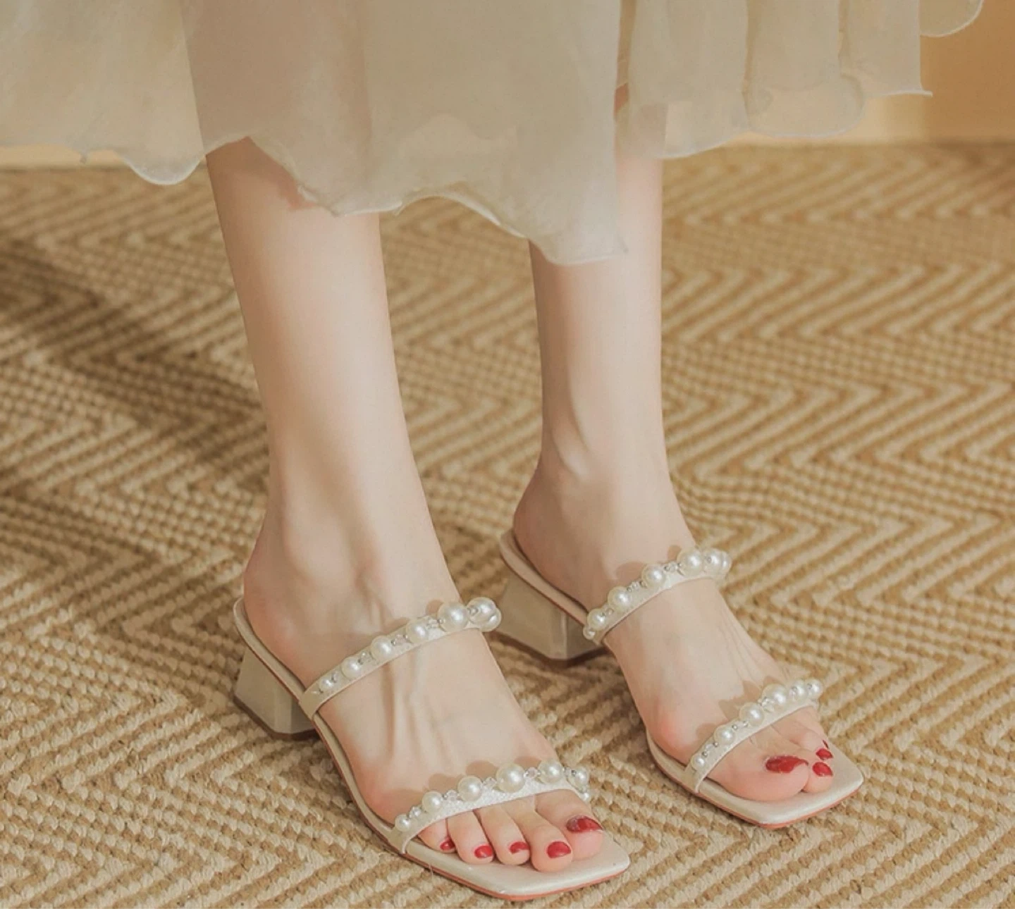 Pearl Strap Block Heel Sandals