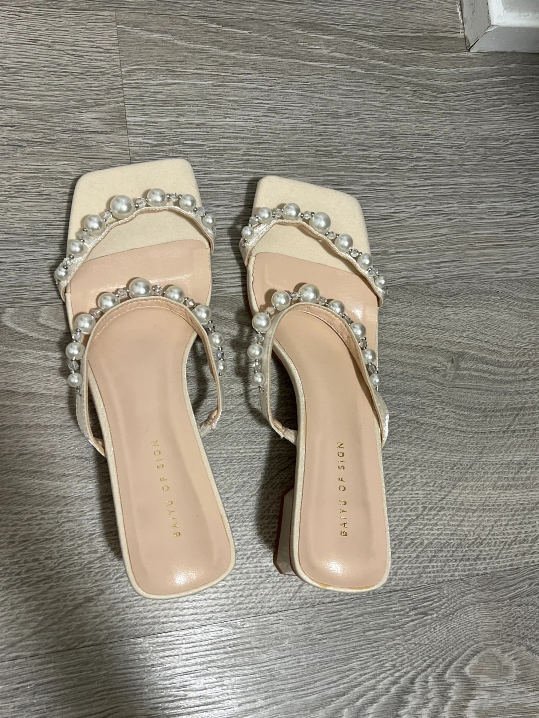These sandals are super cute and in great condition! They feature a block heel and a delicate pearl strap design. Perfect for adding a touch of elegance to any outfit