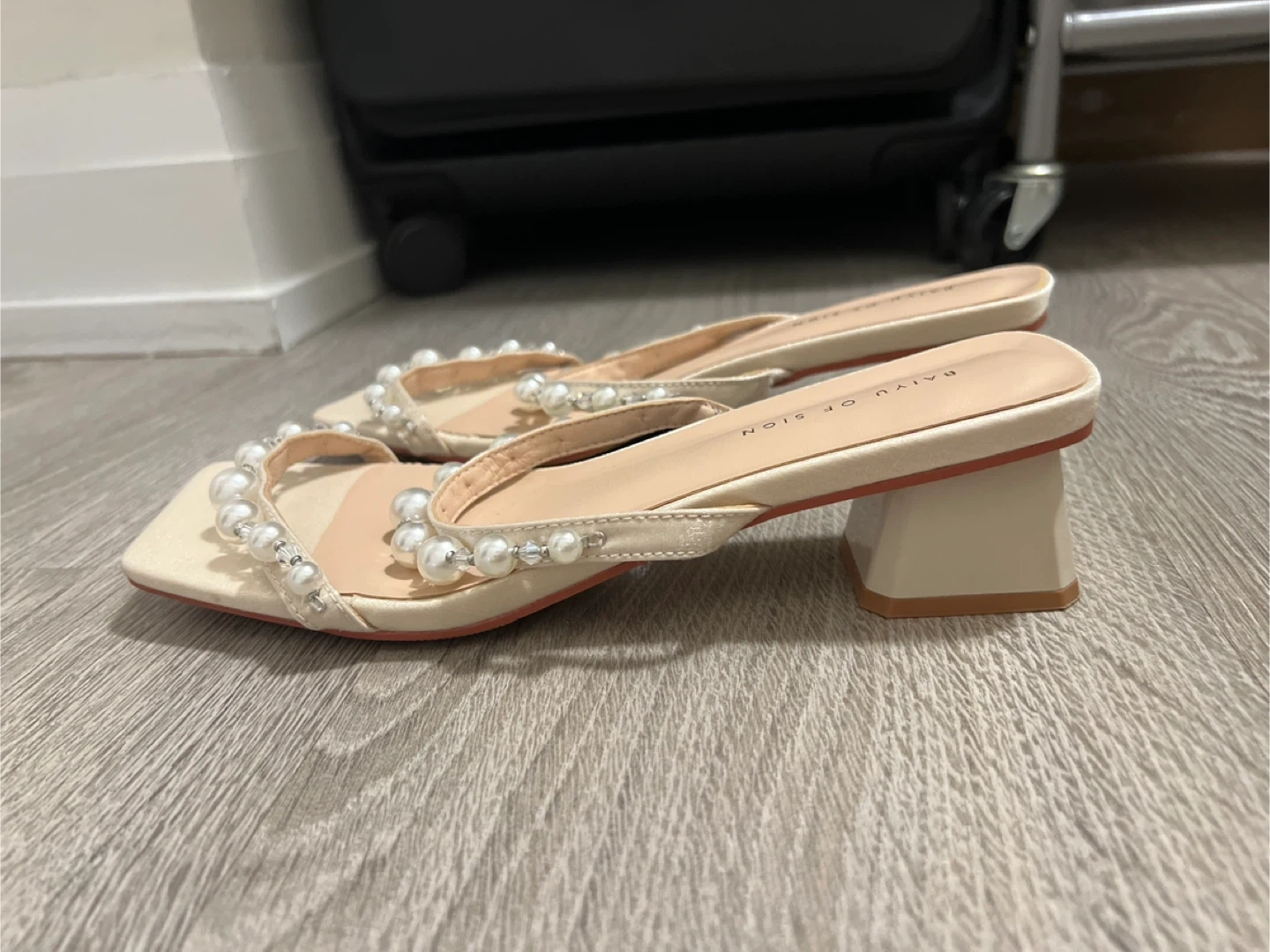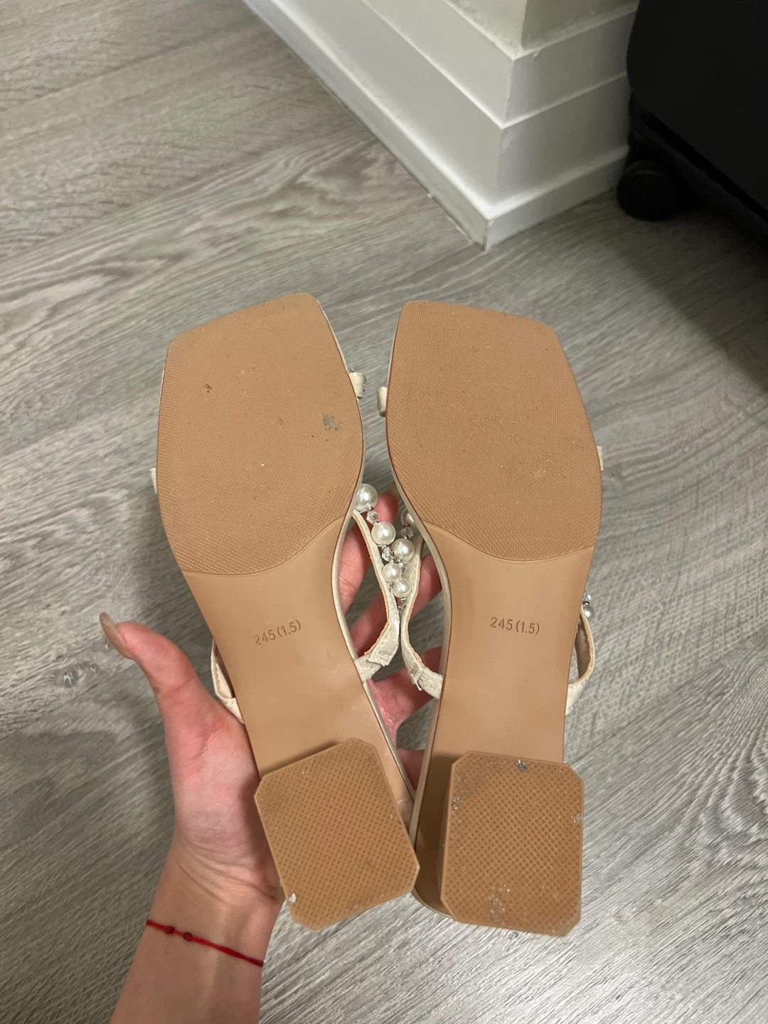 These sandals are super cute and in great condition! They feature a block heel and a delicate pearl strap design. Perfect for adding a touch of elegance to any outfit
