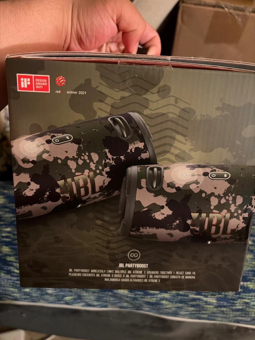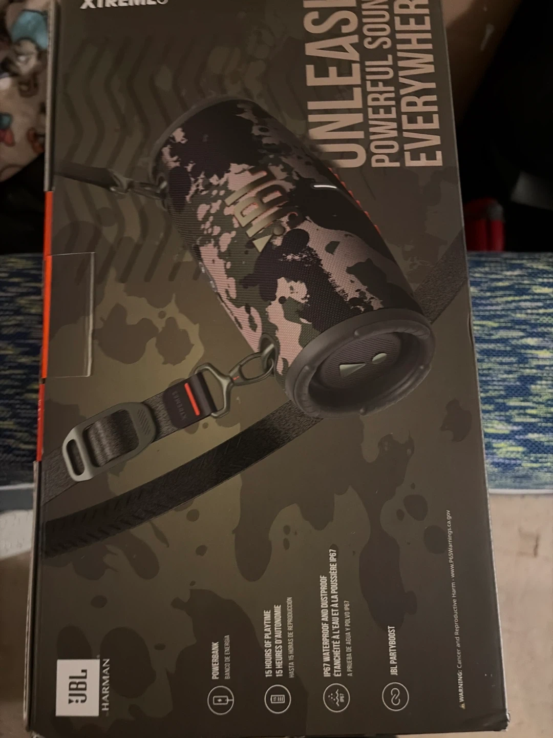 JBL Xtreme 3 portable speaker. It's waterproof and dustproof with Bluetooth 5.1. Offers 15 hours of playtime. Includes a shoulder strap.