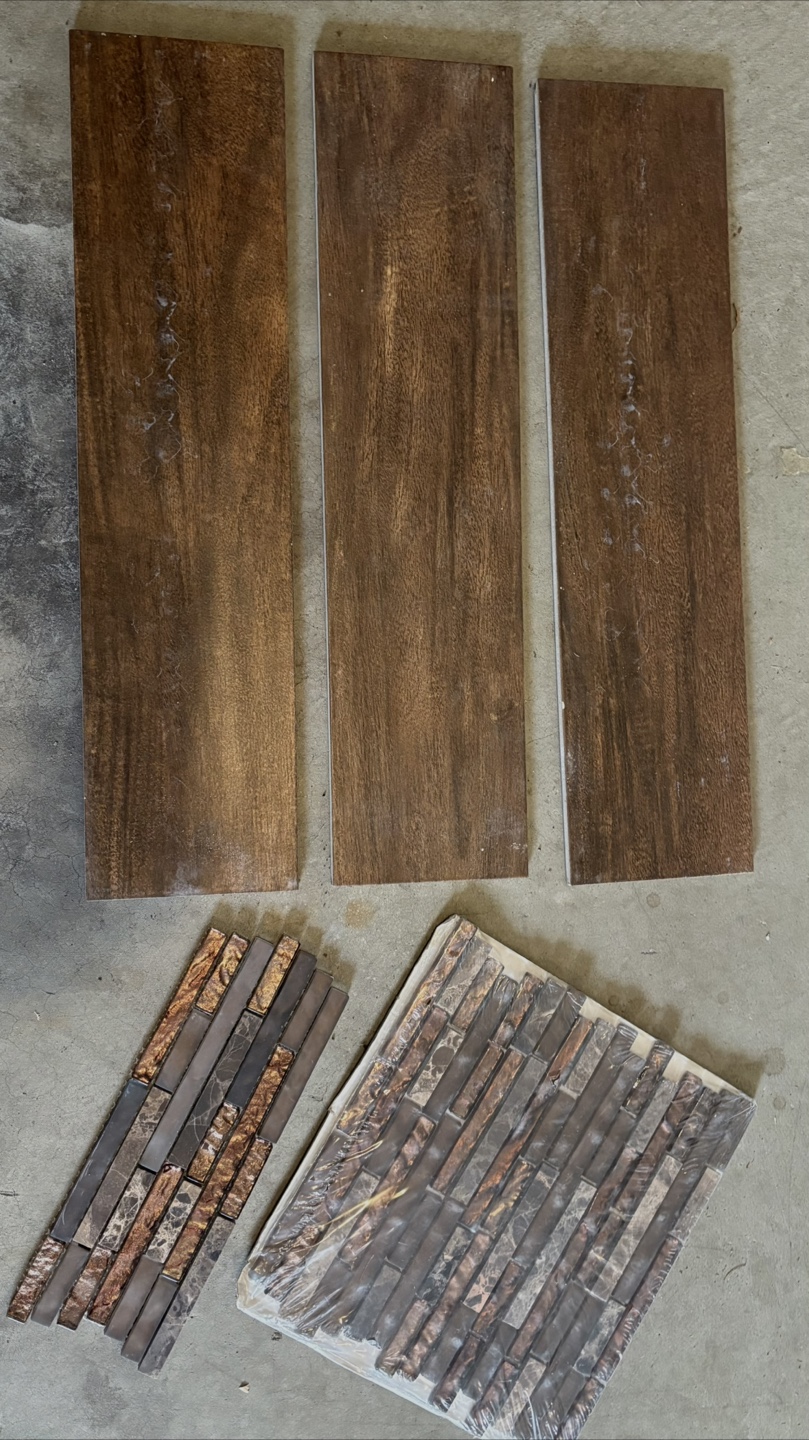 I have some assorted brown tiles for sale. There are three long, wood-look tiles and two smaller mosaic tiles. One of the mosaic tiles is still in its original packaging. Great for a small project or repair!