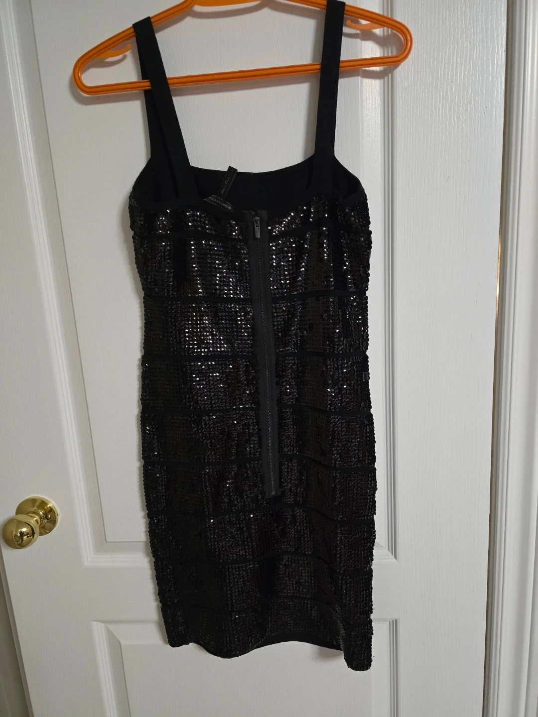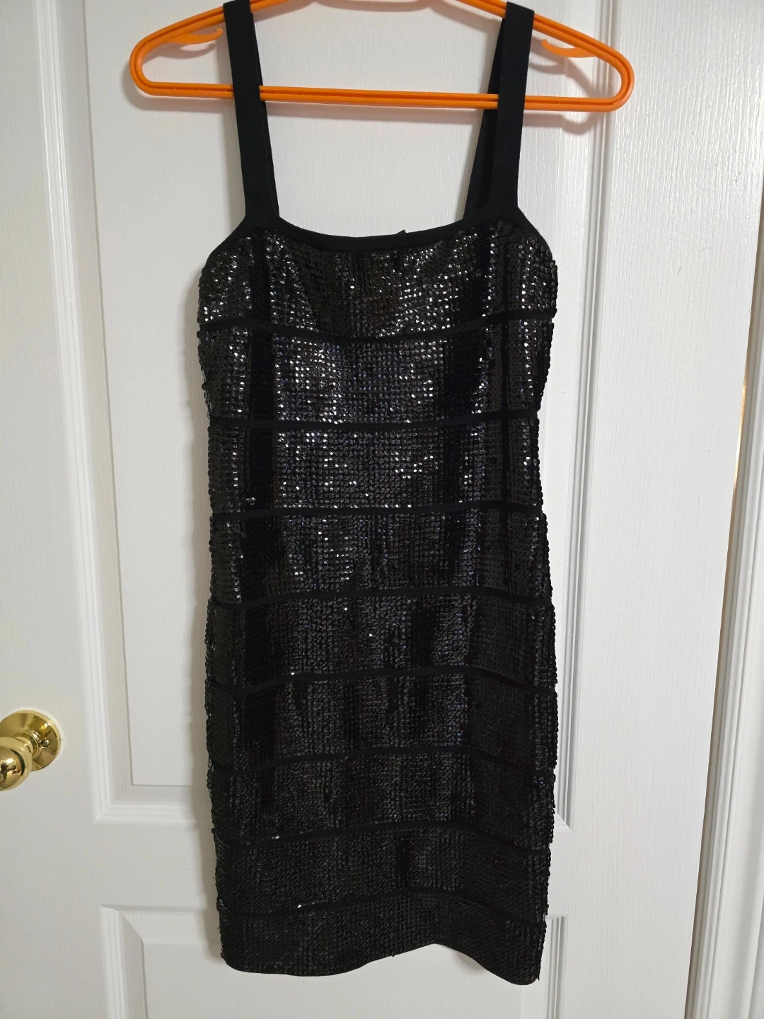 This BCBGMAXAZRIA black dress is covered in sequins. It features a sheath silhouette and a zippered back. Size S.