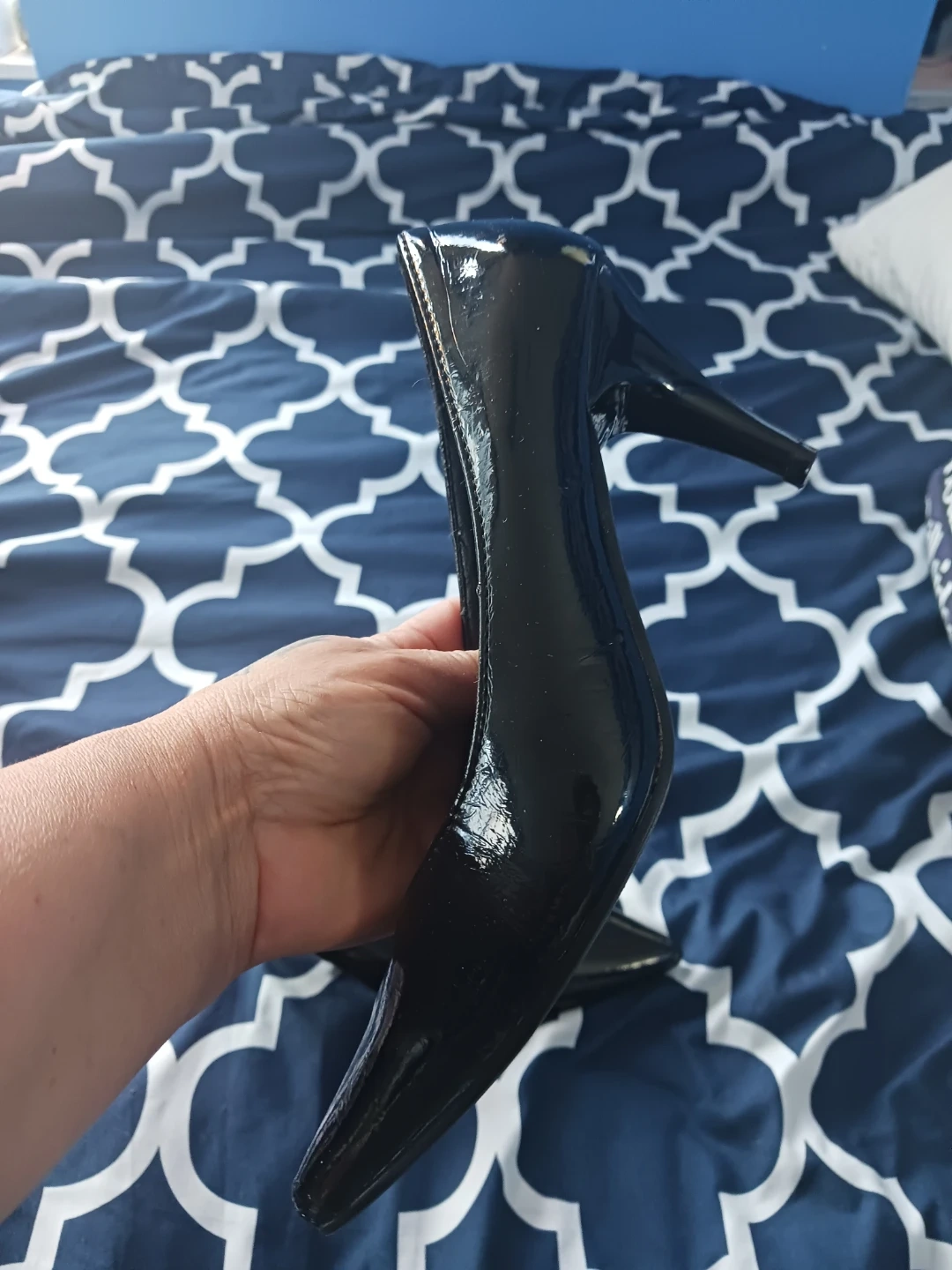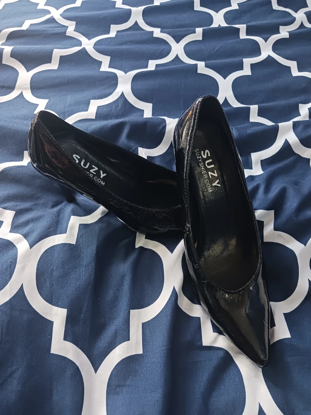 Selling a pair of sleek black heels from Suzy Shier! They're a size 8 and have a shiny, patent leather look. Perfect for dressing up any outfit