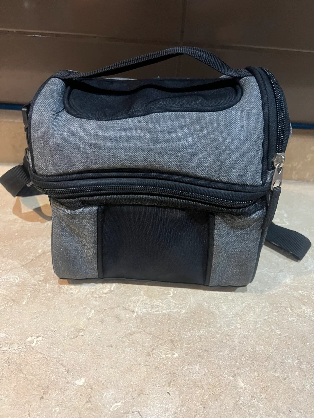 This is a grey insulated lunch bag with a dual zippered compartment. It's made of durable fabric and features a silver-lined interior for keeping food cool. The bag has a top carry handle and an adjustable shoulder strap.