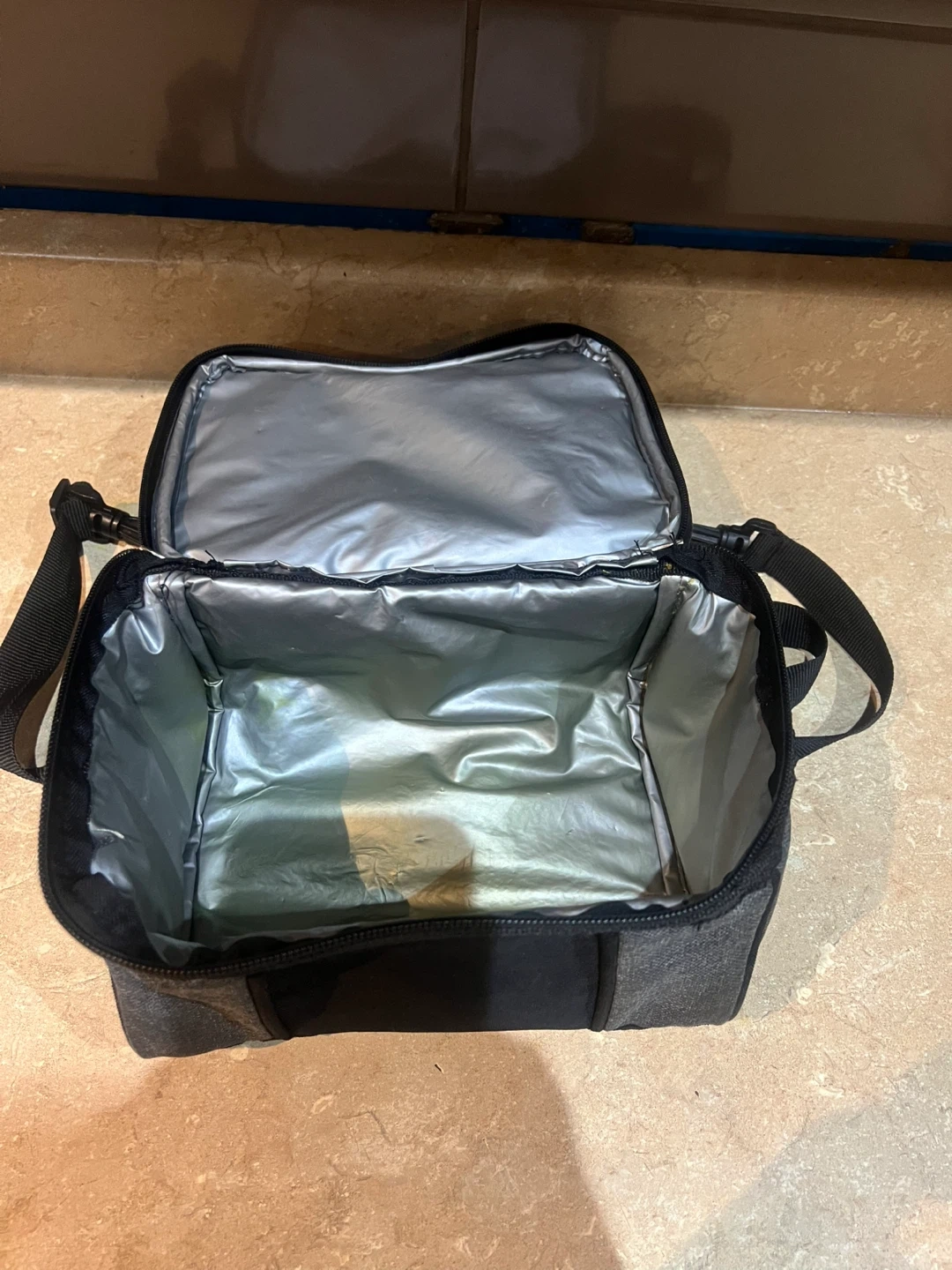 This is a grey insulated lunch bag with a dual zippered compartment. It's made of durable fabric and features a silver-lined interior for keeping food cool. The bag has a top carry handle and an adjustable shoulder strap.