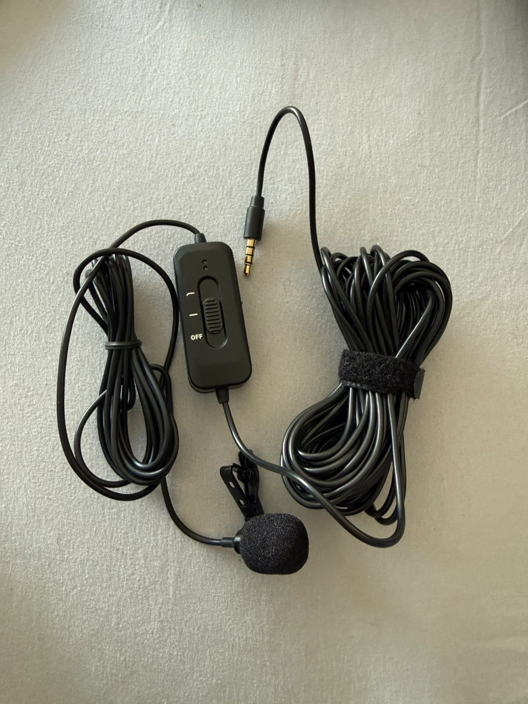 This is a black lavalier microphone, ideal for recording clear audio. It features a long cable and a 3.5mm audio jack for broad compatibility. The clip-on design makes it easy to attach to clothing for hands-free use.