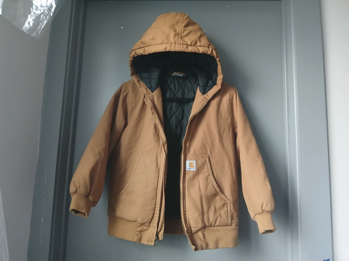 Carhartt boys' quilted flannel lined duck active jacket. Features a brown canvas exterior with a black quilted lining. Includes a hood and zipper closure.