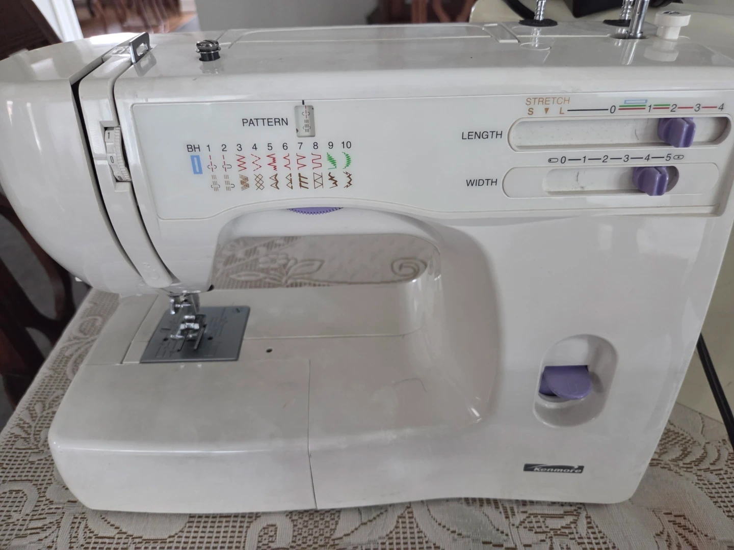This is a white Kenmore sewing machine. It includes multiple stitch patterns, adjustable length, and width settings. The sewing machine comes with its original cover and power charger