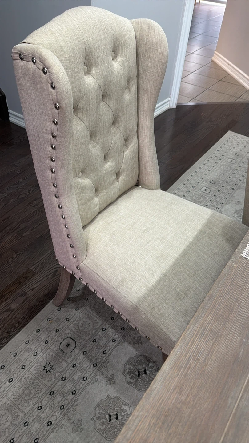 This elegant dining chair features a high tufted back with decorative nailhead trim. It's upholstered in a neutral linen-look fabric with a wooden leg base and a convenient ring pull on the back. Its classic design adds a touch of sophistication to any dining space.