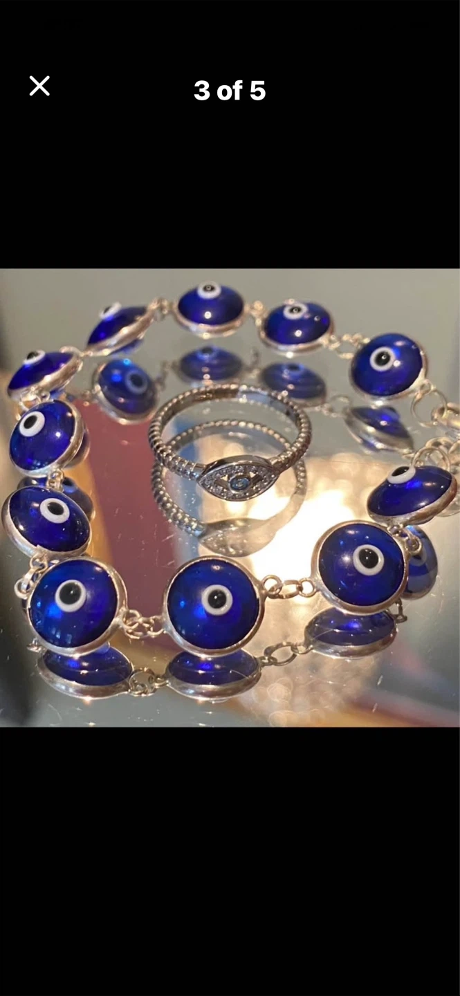 💙Selling a Fabulous Blue lapis Lazuli evil eye bracelet, ring, & necklace set. The bracelet features blue evil eye beads linked together, and the ring has a matching evil eye design surrounded by small stones in size 6. The necklace was imported from France! A unique set to add to your collection!💙
