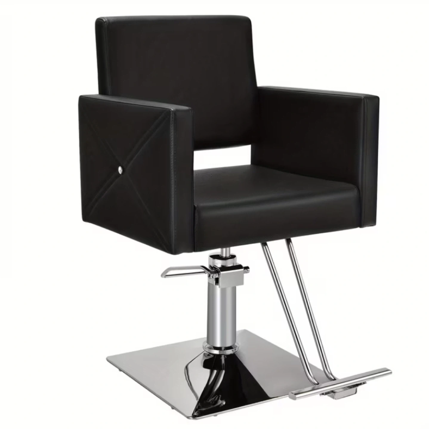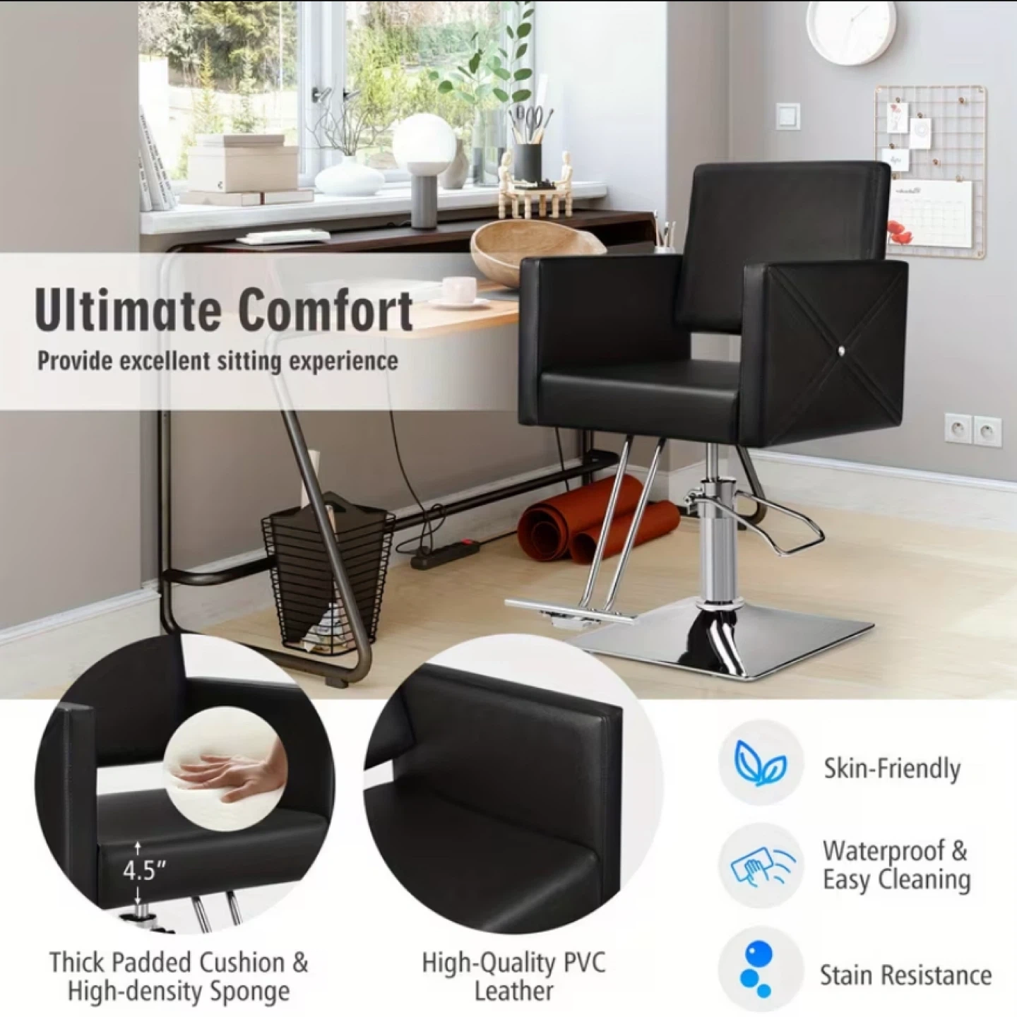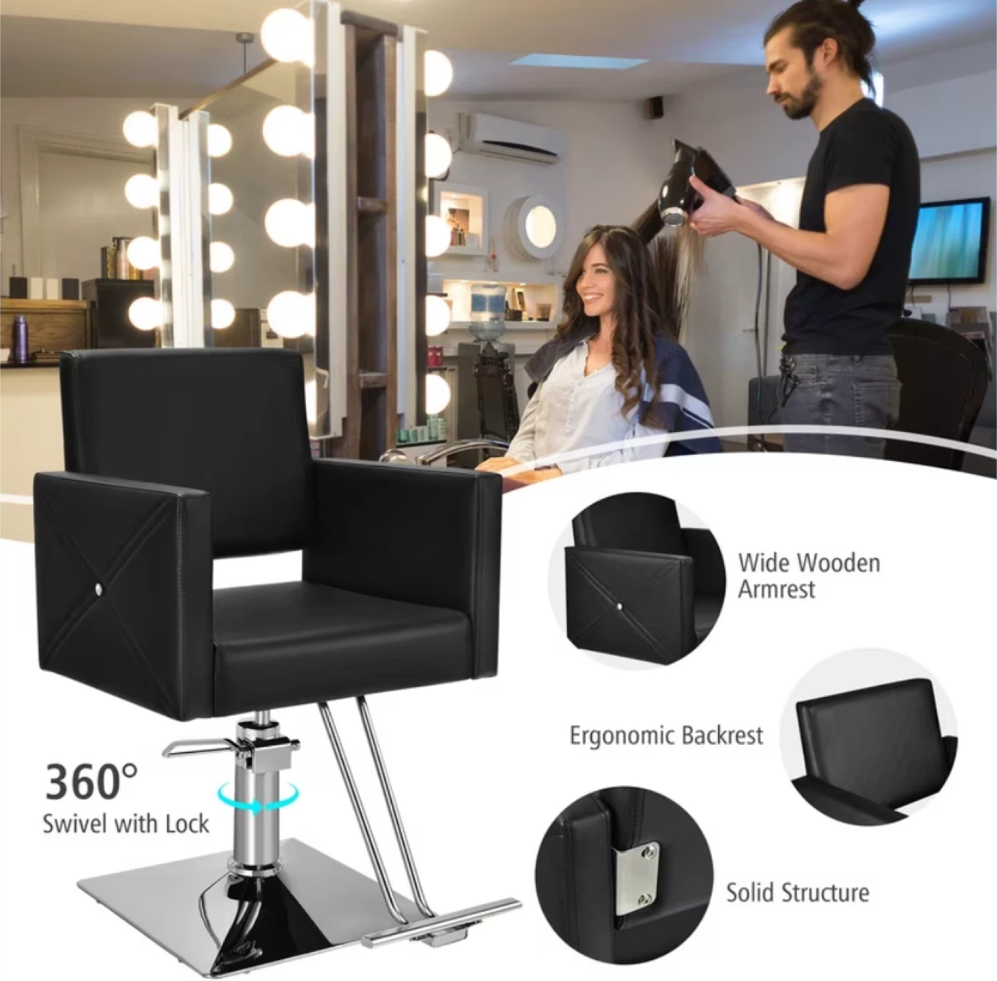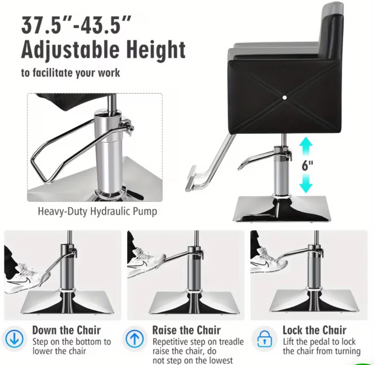 Looking to upgrade your salon or barber shop? This black hydraulic chair is perfect! It features a 360° swivel with lock, a wide wooden armrest, and an ergonomic backrest for ultimate comfort. The chair also has a sturdy and durable electroplating pedal and a stable metal base, so it's not easy to fall. The height is adjustable from 37.5" to 43.5" to facilitate your work. The thick padded cushion is made of high-density sponge and high-quality PVC leather, which is skin-friendly, waterproof, and easy to clean