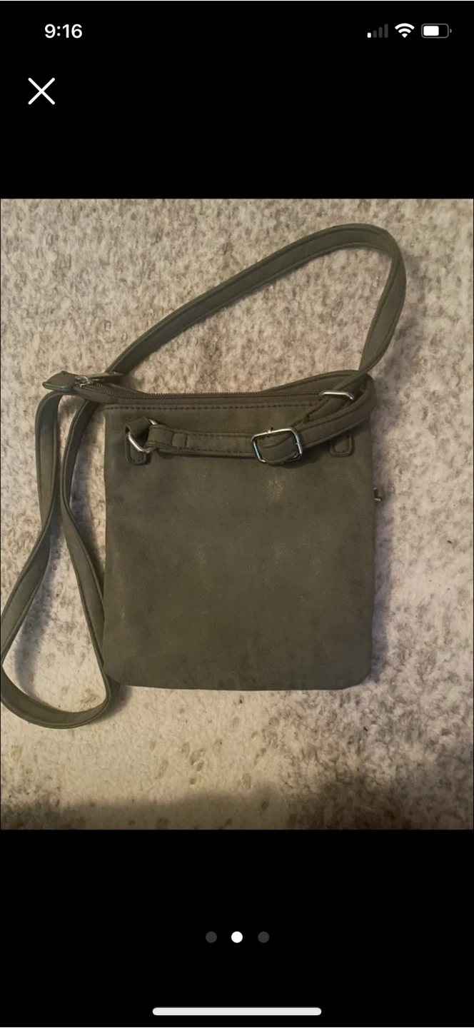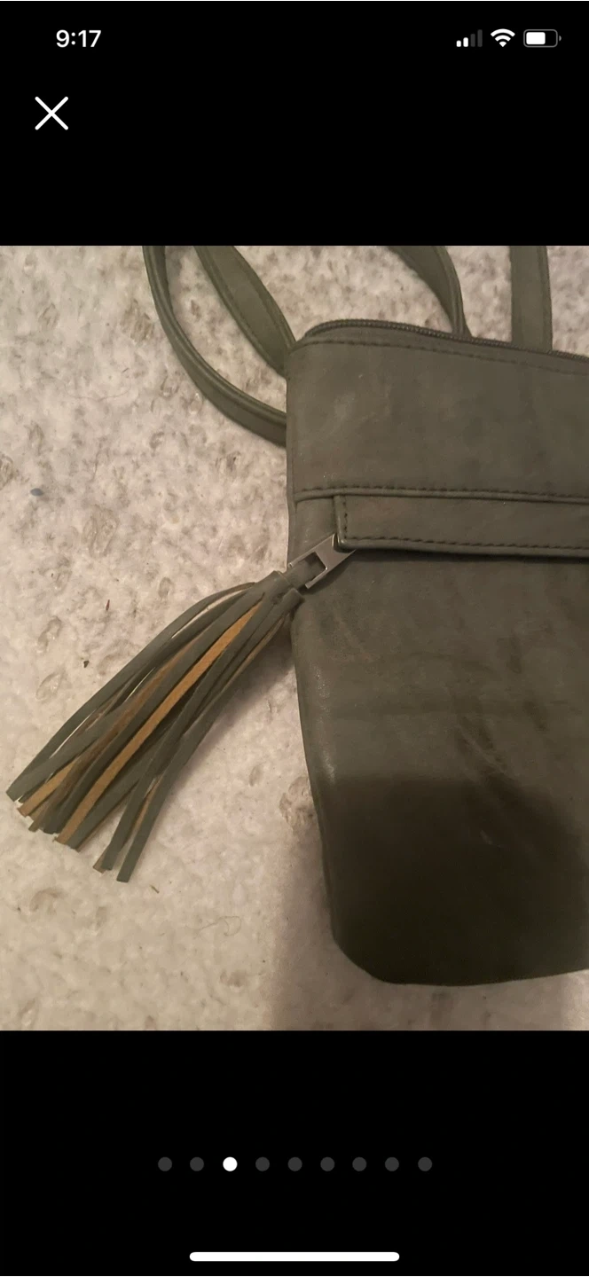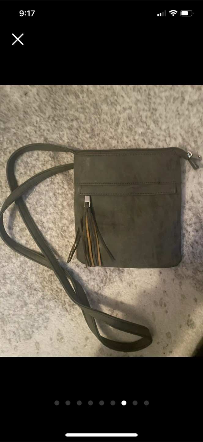 This olive green crossbody purse has a decorative tassel. It's made of a faux leather material. The strap is adjustable.