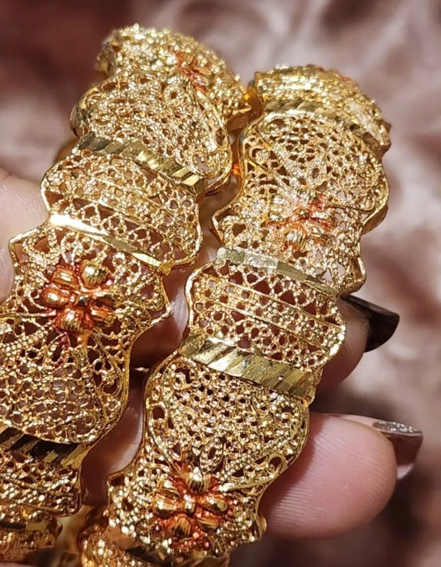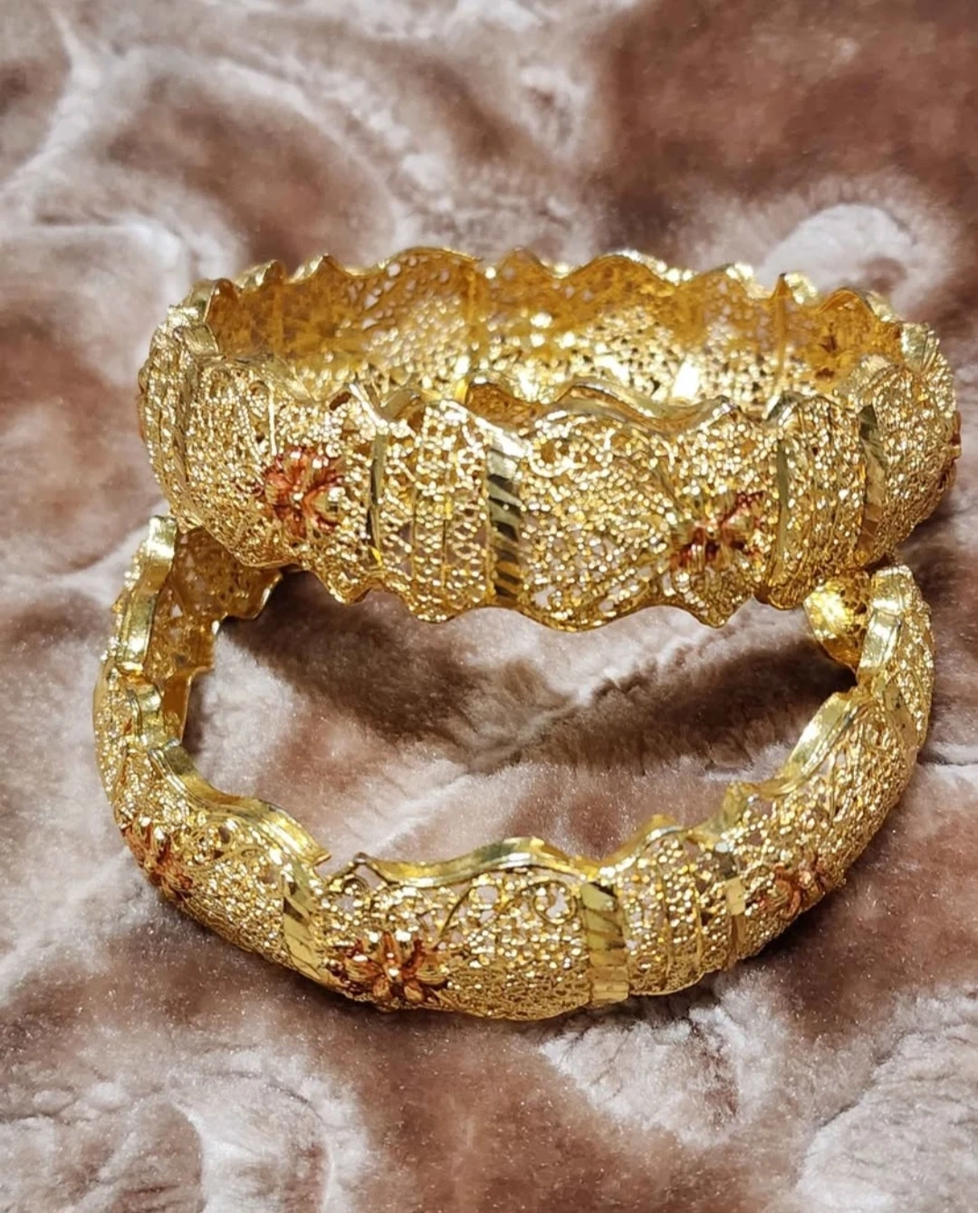 Selling a pair of gold bangles. They have a beautiful intricate design. Perfect for adding a touch of elegance to any outfit!