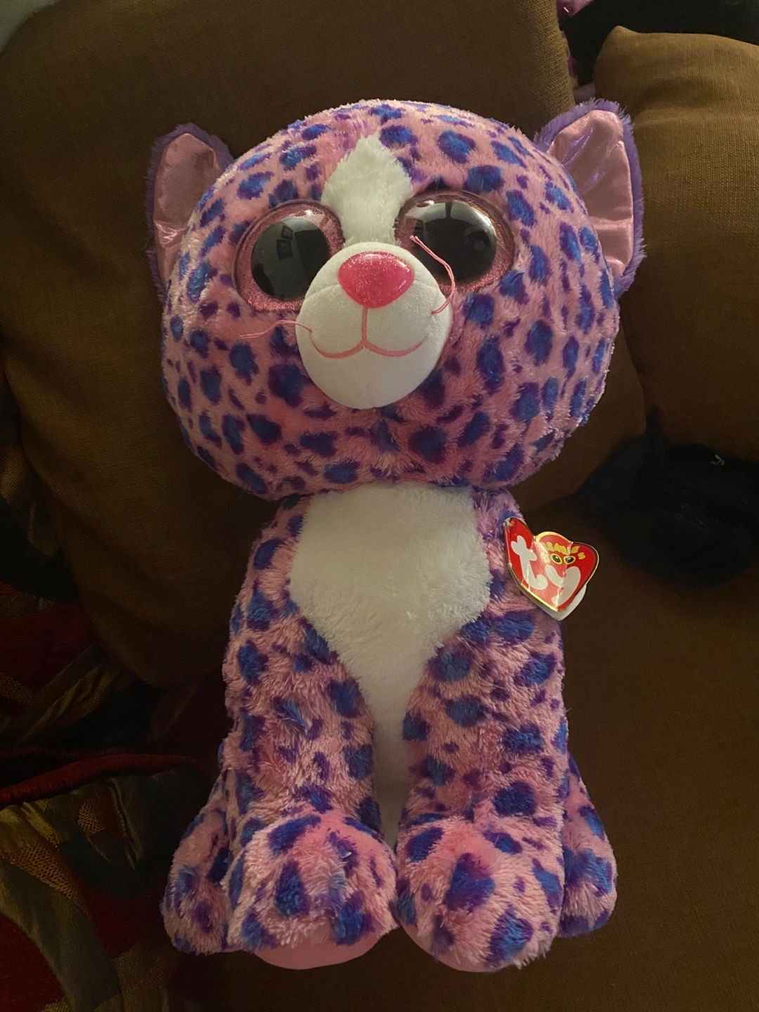 Selling a large Ty Beanie Boos plush toy named Prince. It's in great condition and ready for a new home! It's a super cute stuffed animal with a pink and purple leopard print pattern, and the classic big Beanie Boos eyes. Perfect for collectors or kids! Size 16 inches tall