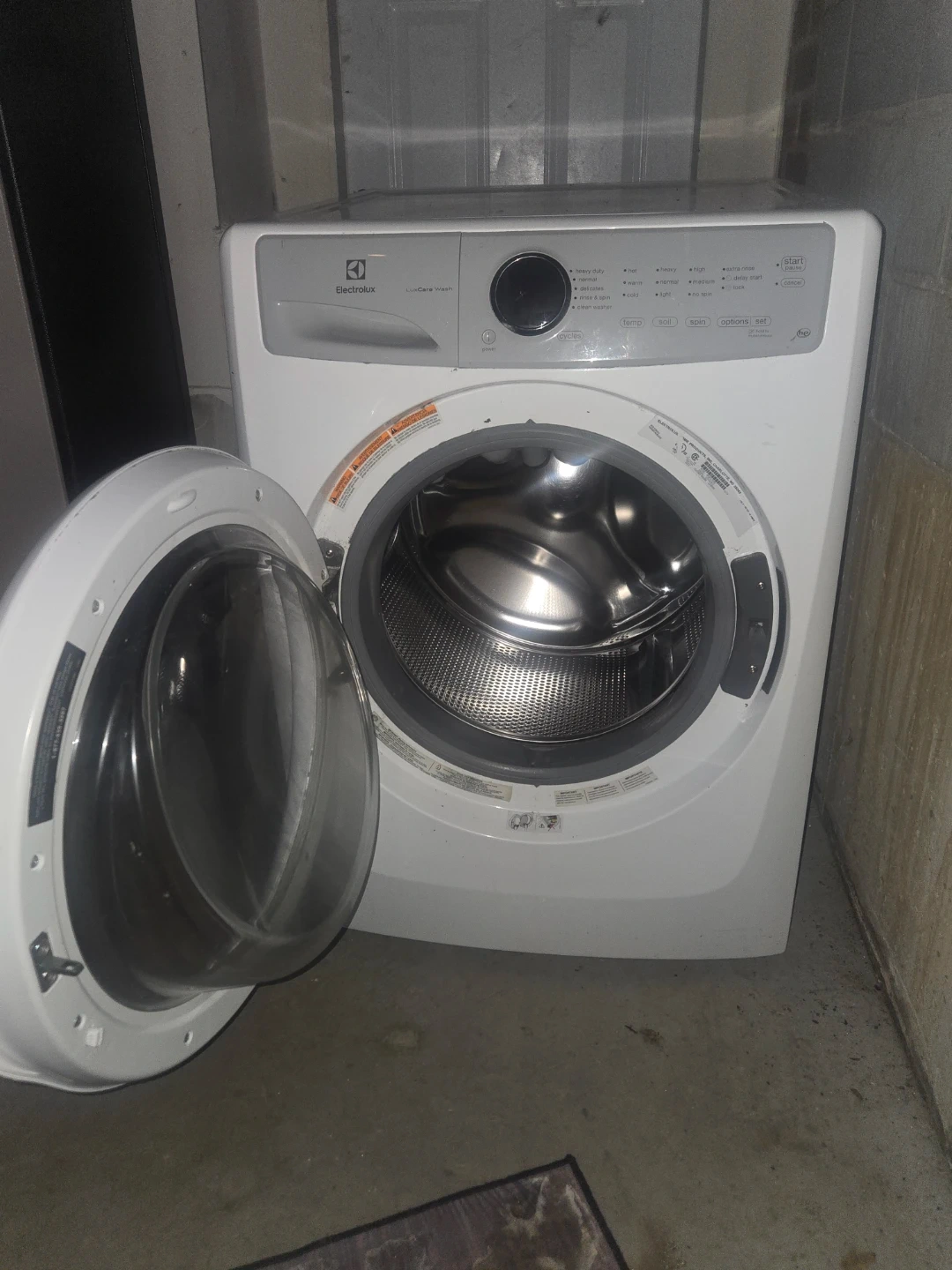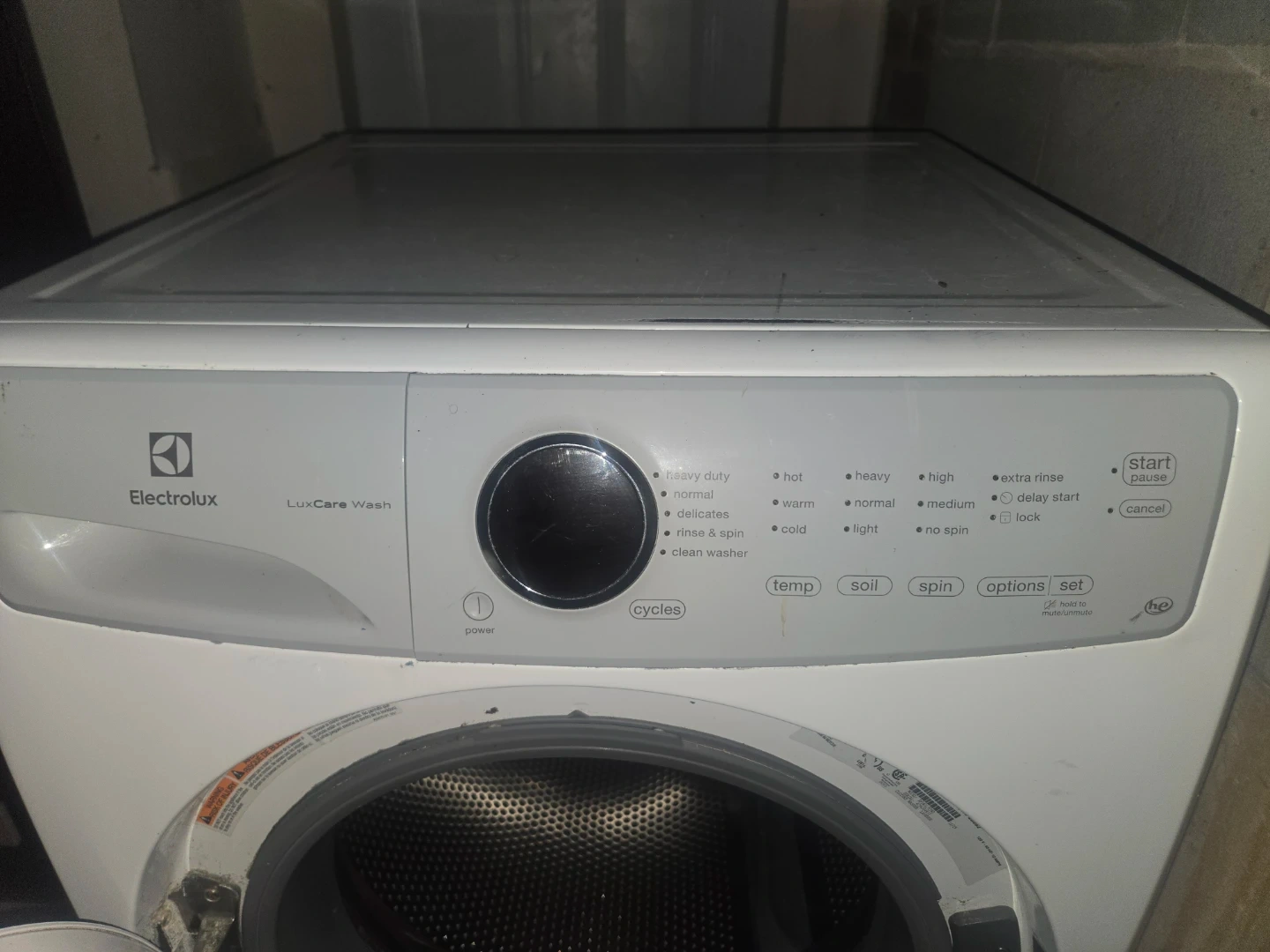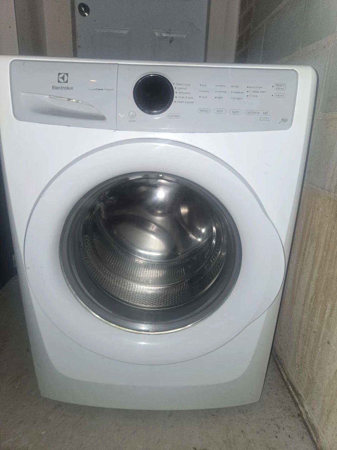 This is an Electrolux LuxCare Wash front load washing machine. It has multiple wash cycles and options, including hot, warm, and cold water settings. It also includes a delay start option.