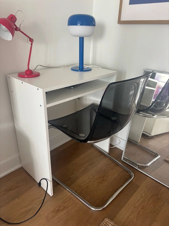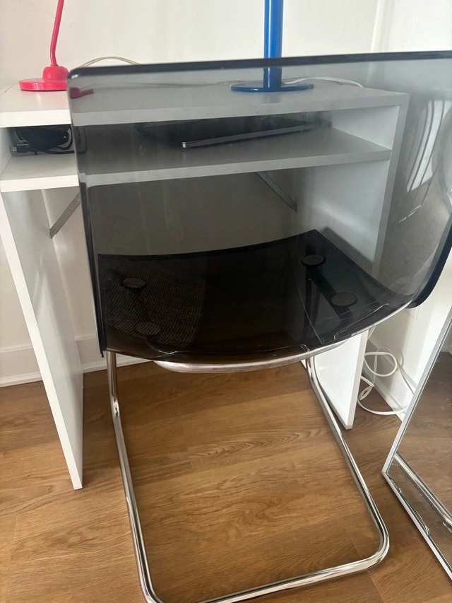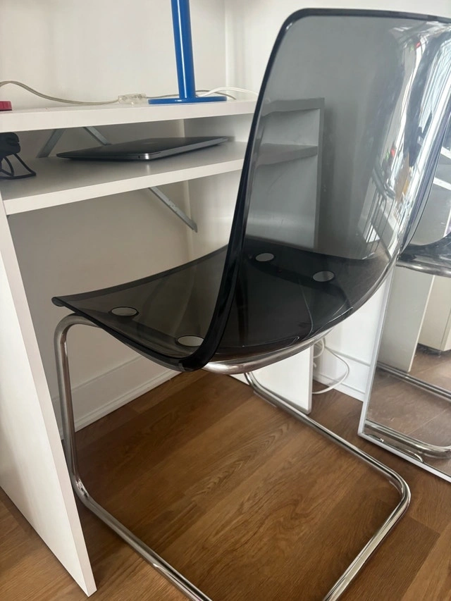 This rare grey sleek and modern Ikea Tobias chair features a transparent seat and chrome legs, perfect for adding a contemporary touch to any dining or office space. The chair is very sturdy. Additional specs include: Transparent seat, Chrome-plated steel frame, Weight tested: 110 kg, Seat width: 48 cm, Seat depth: 46 cm, Seat height: 44 cm, Height: 85 cm. Cash accepted.