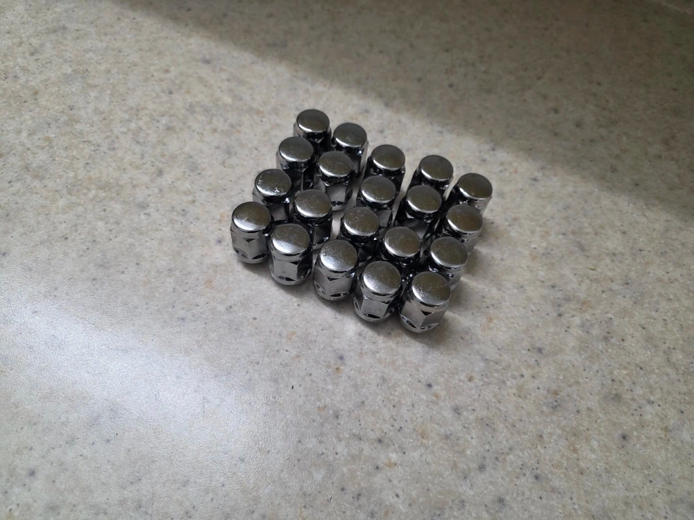 Selling a set of 20 chrome lug nuts. They are M12 x 1.5 thread and 13/16" 21mm hex. Each lug nut is 35mm (1.37") tall and 24mm (0.94") wide at the base.