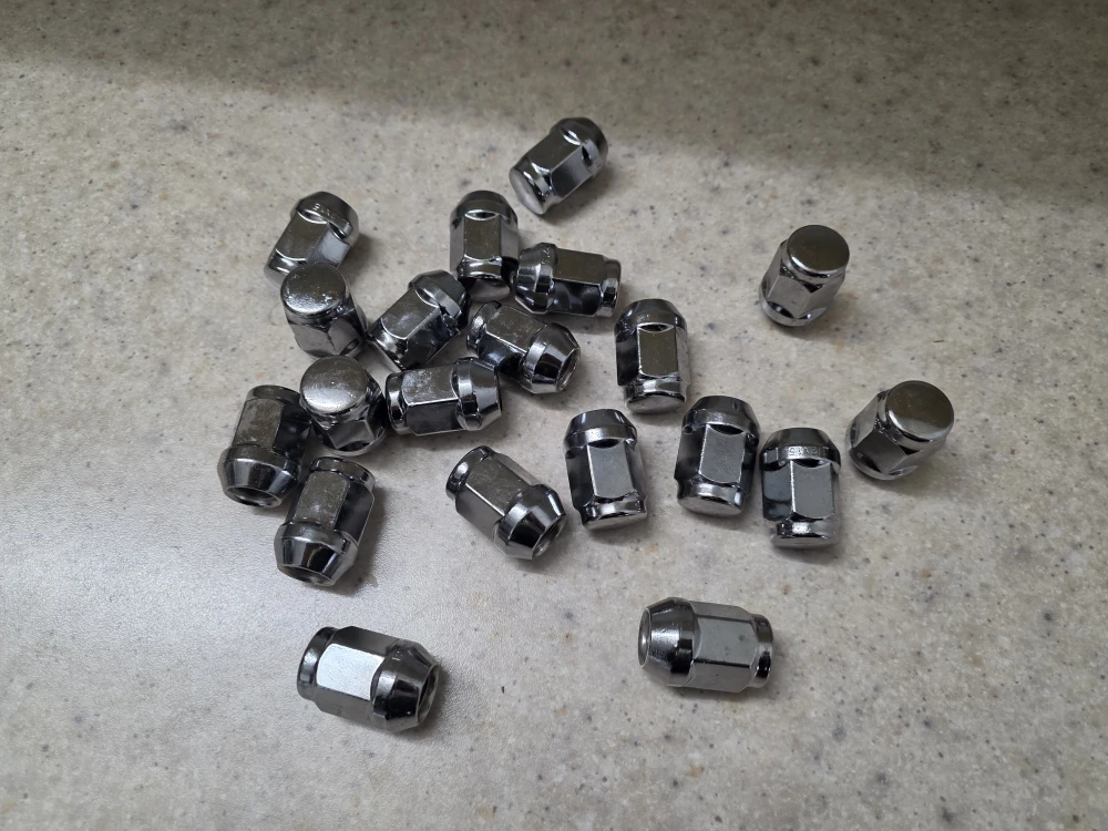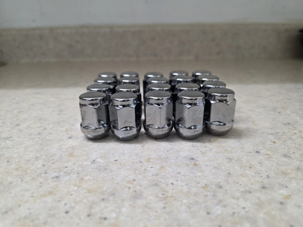 Selling a set of 20 chrome lug nuts. They are M12 x 1.5 thread and 13/16" 21mm hex. Each lug nut is 35mm (1.37") tall and 24mm (0.94") wide at the base.