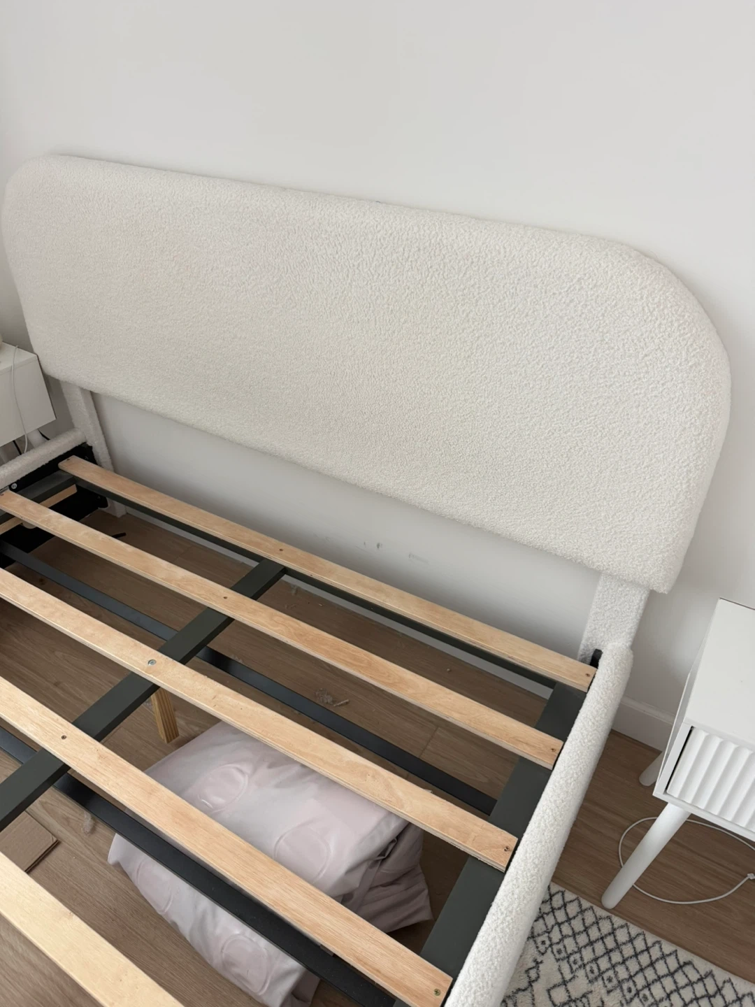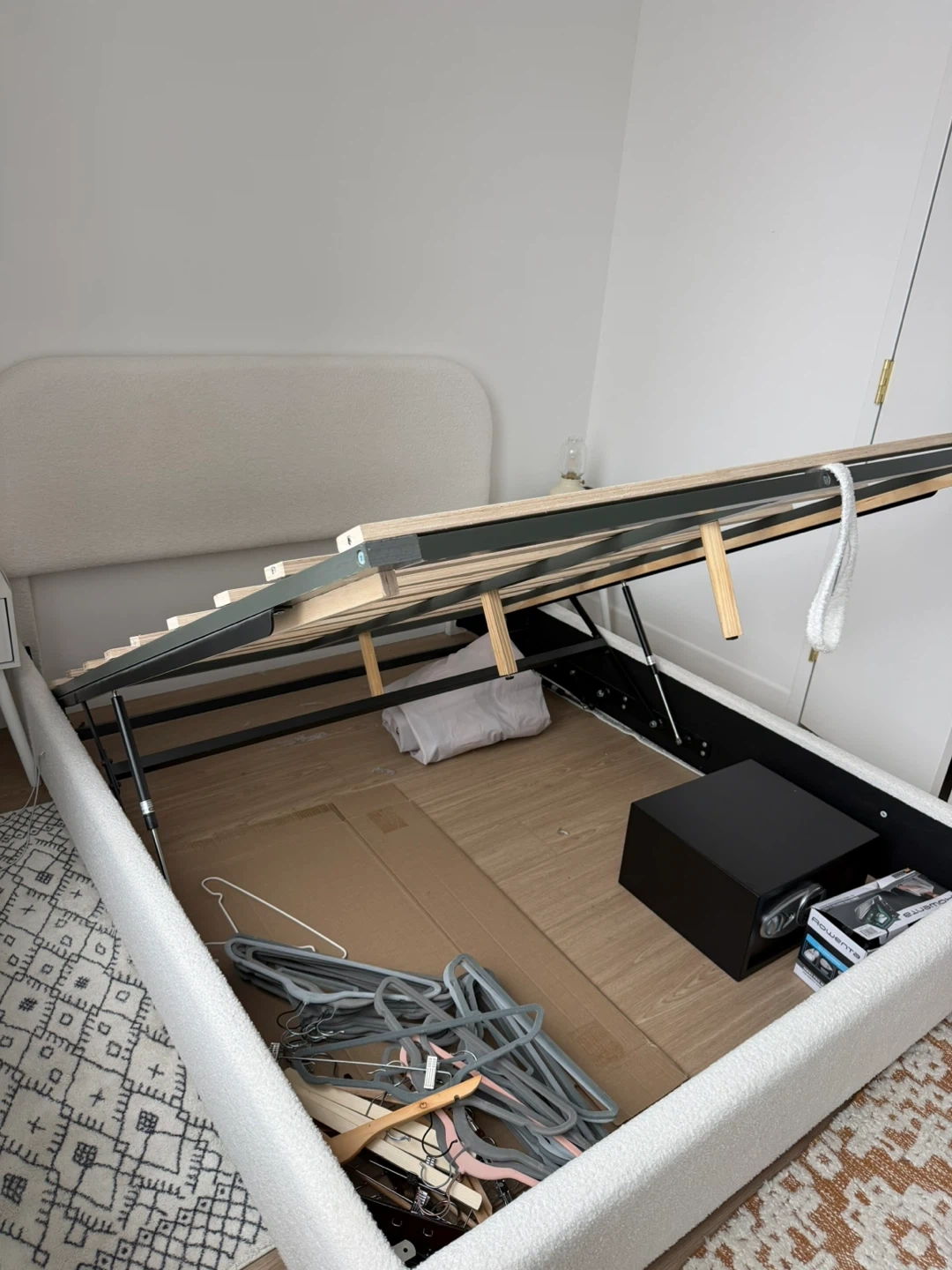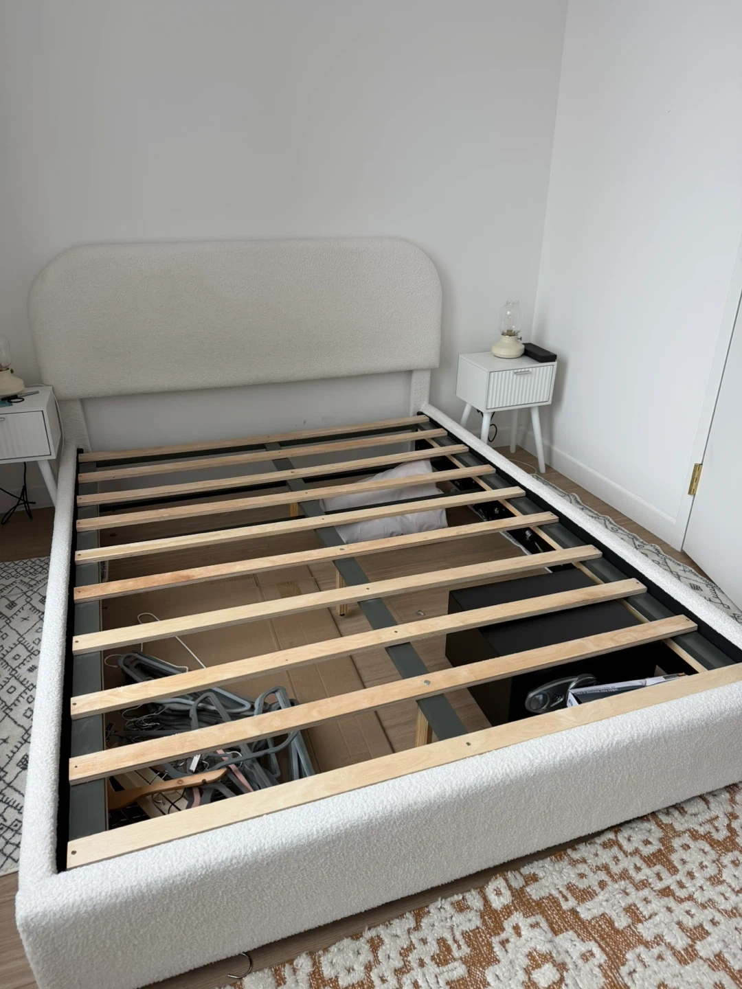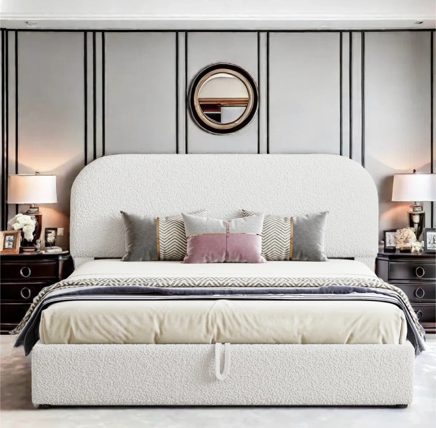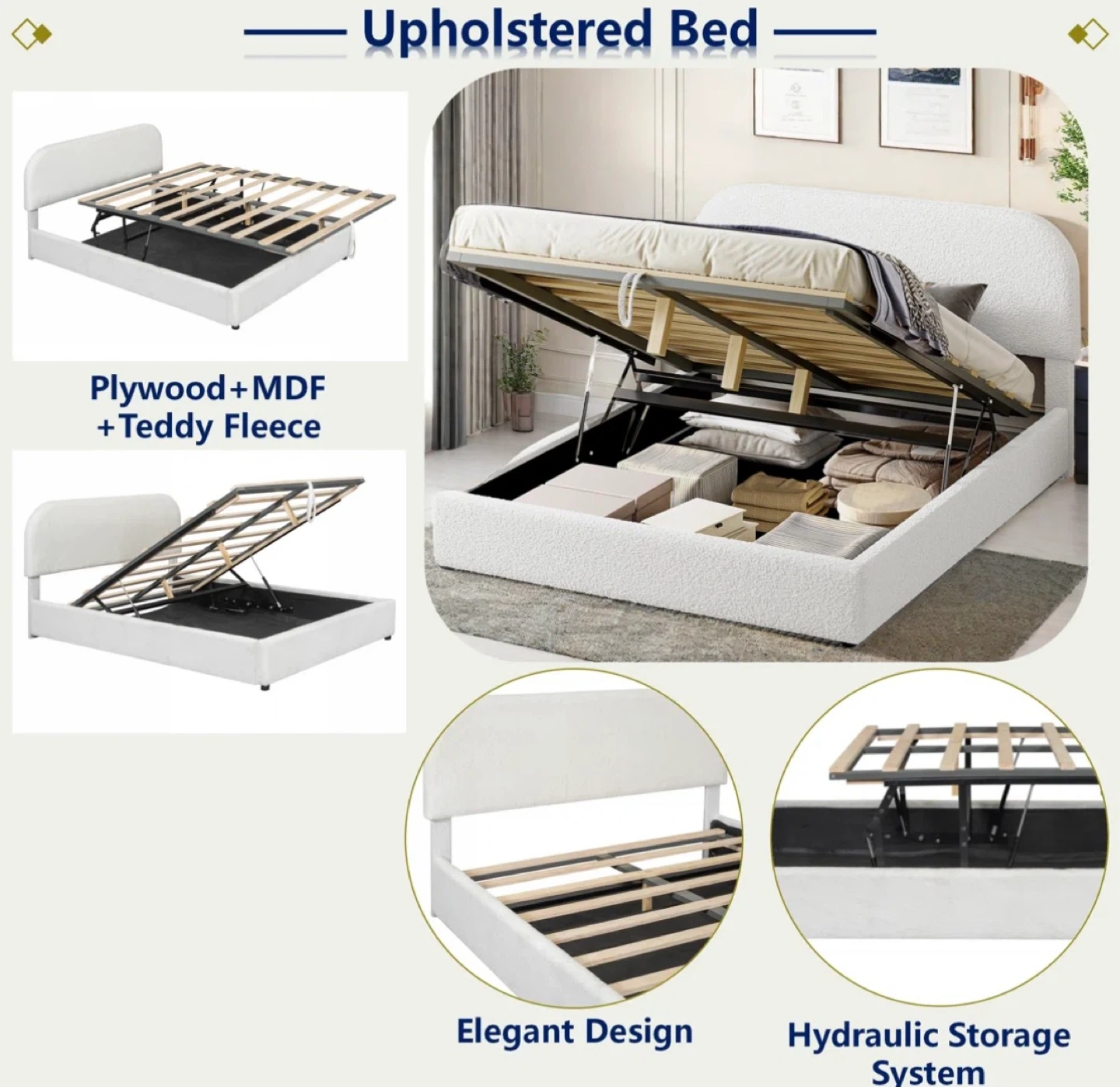 Queen size This upholstered bed frame features a curved headboard and a textured white fabric. It includes a lift mechanism for under-bed storage. Overall dimensions are 83.1" L x 64.2" W x 40.6" H. Mattress not included.