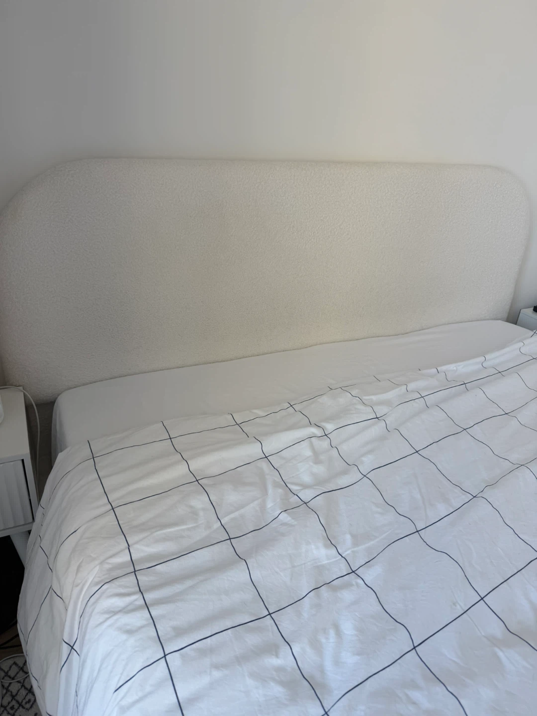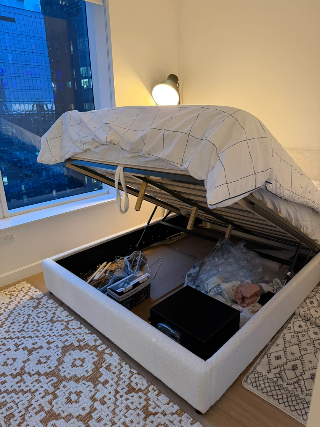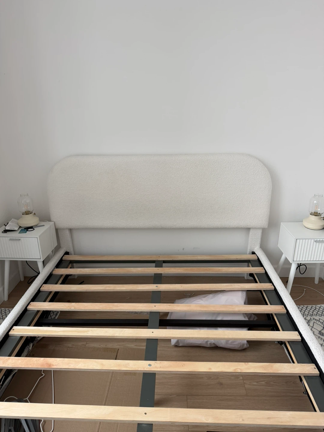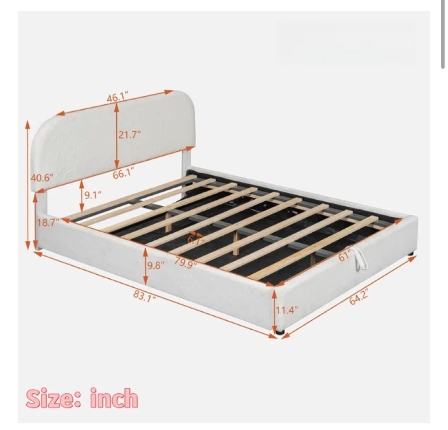 Queen size This upholstered bed frame features a curved headboard and a textured white fabric. It includes a lift mechanism for under-bed storage. Overall dimensions are 83.1" L x 64.2" W x 40.6" H. Mattress not included.