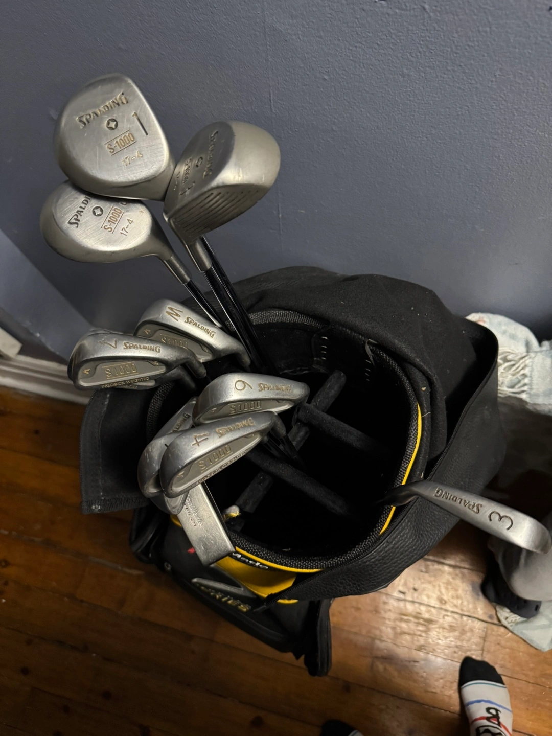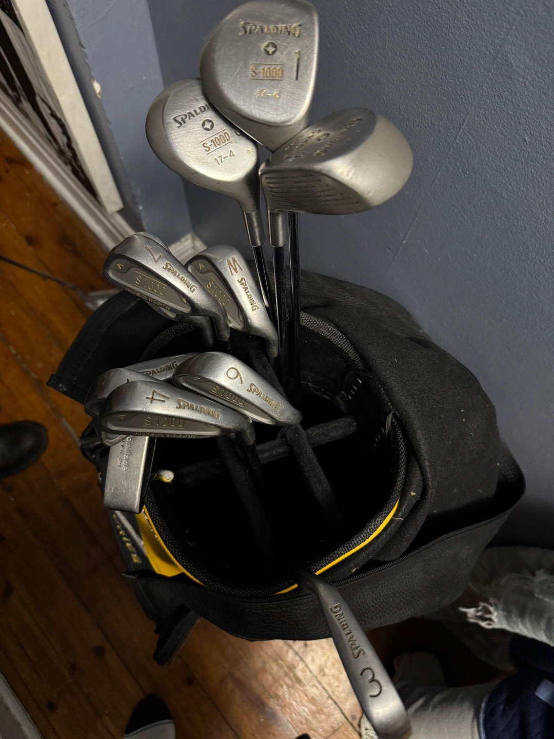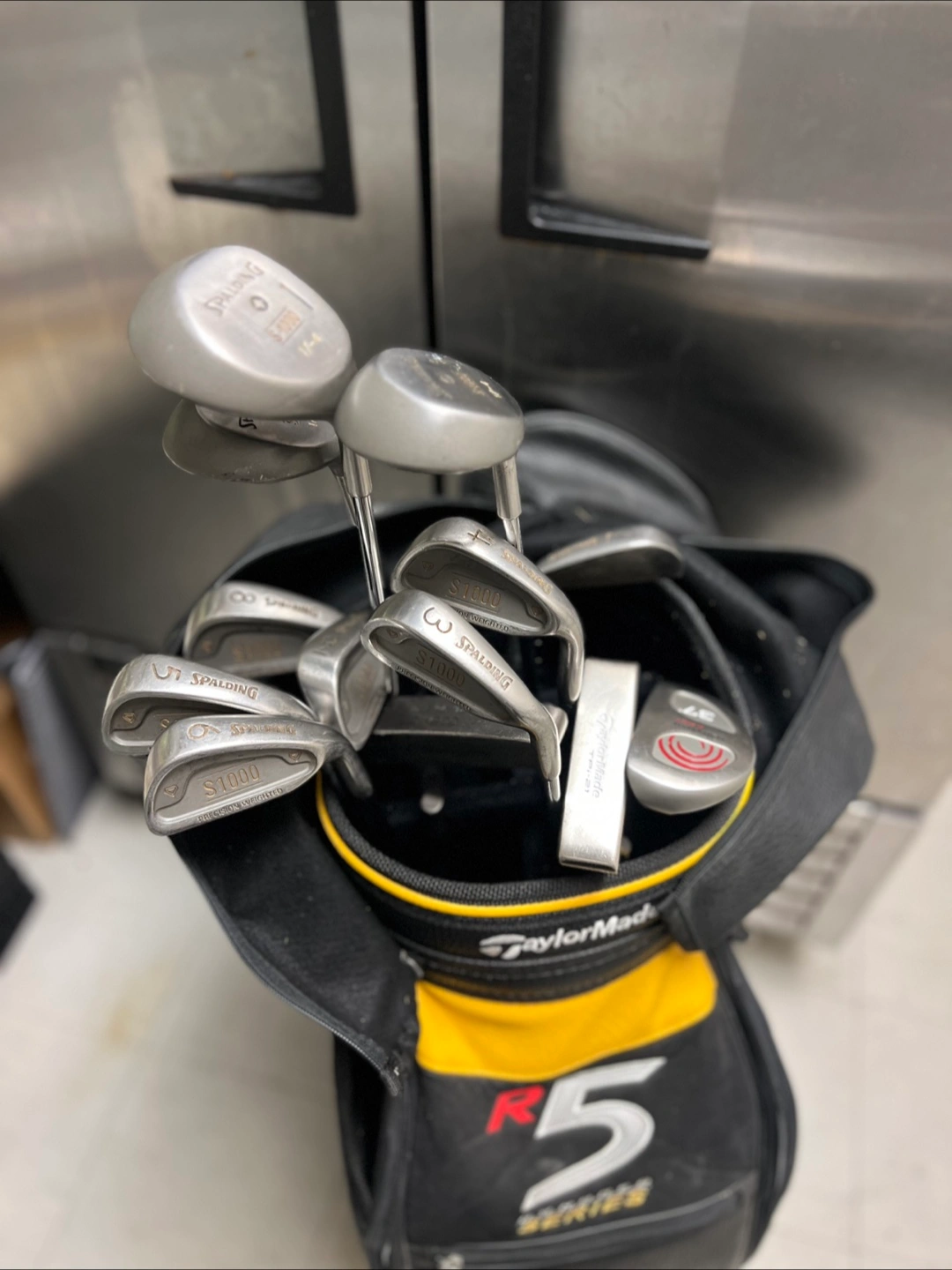 Spalding S-1000 golf club set. Includes various irons, woods, and a putter. TaylorMade R5 cart bag included. One TaylorMade and one Odyssey putter also included. Used condition.