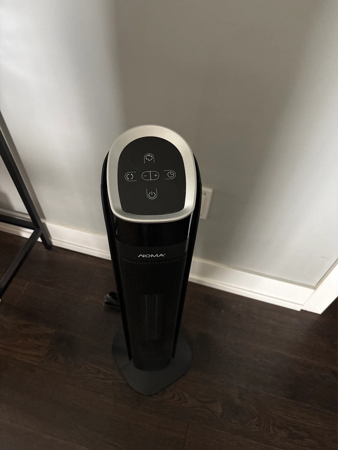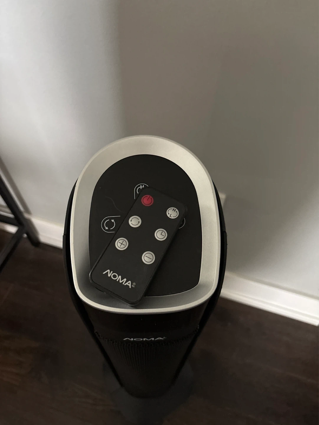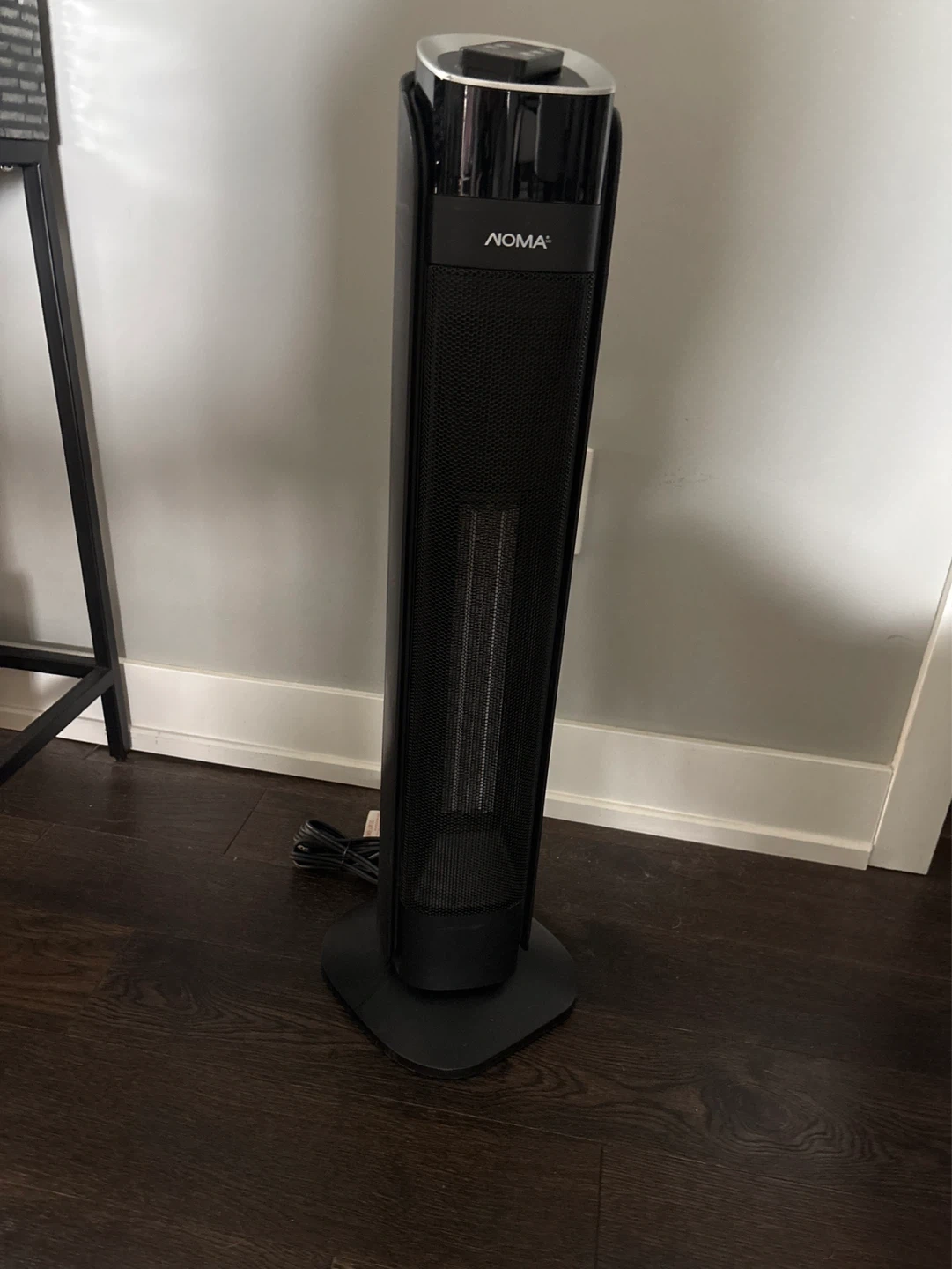 Noma tower heater in black. It comes with a remote control for easy operation. This heater is designed for personal space heating. it is in good condition like new and oscillate well also allowing temperature automatic setting.
