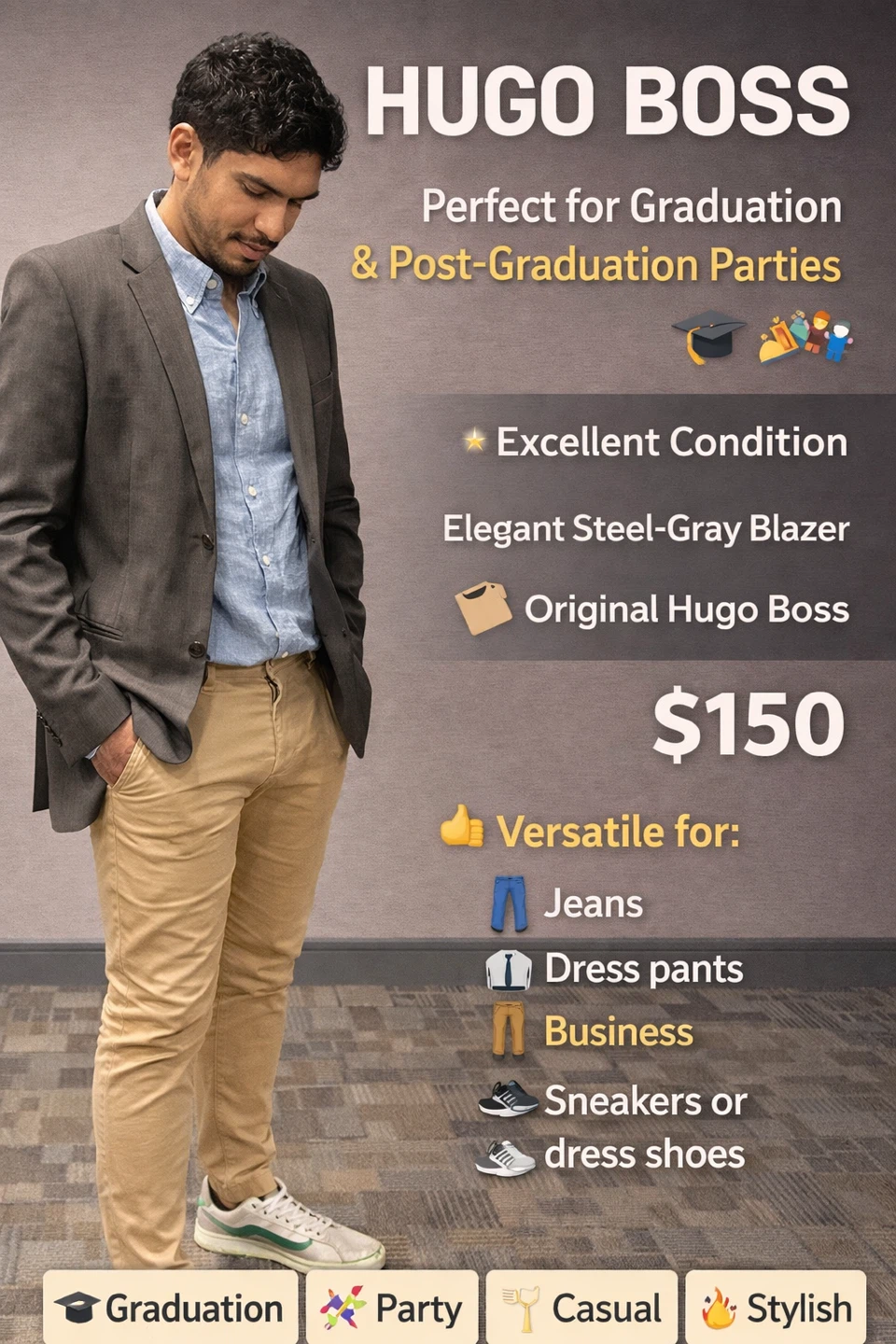 1 / 91 / 9Buy & SellHugo Boss Men's BlazerHugo Boss Men's Blazer$135Elegant steel-gray blazer from Hugo Boss, made in Turkey. Jacket length is 75cm. Perfect for dressy or casual occasions.Size40 BrandHugo BossWHERE TO MEETCrown Hill EtobicokeView MapSELLERverifiedGracesStonegate912 reviews0 chats·0 favorites·20 viewsSEND CHAT TO SELLERHi Graces! I’m interested in your listing.Hi Graces! I’m interested in your listing.Get the Karrot app to chatSign In to chat