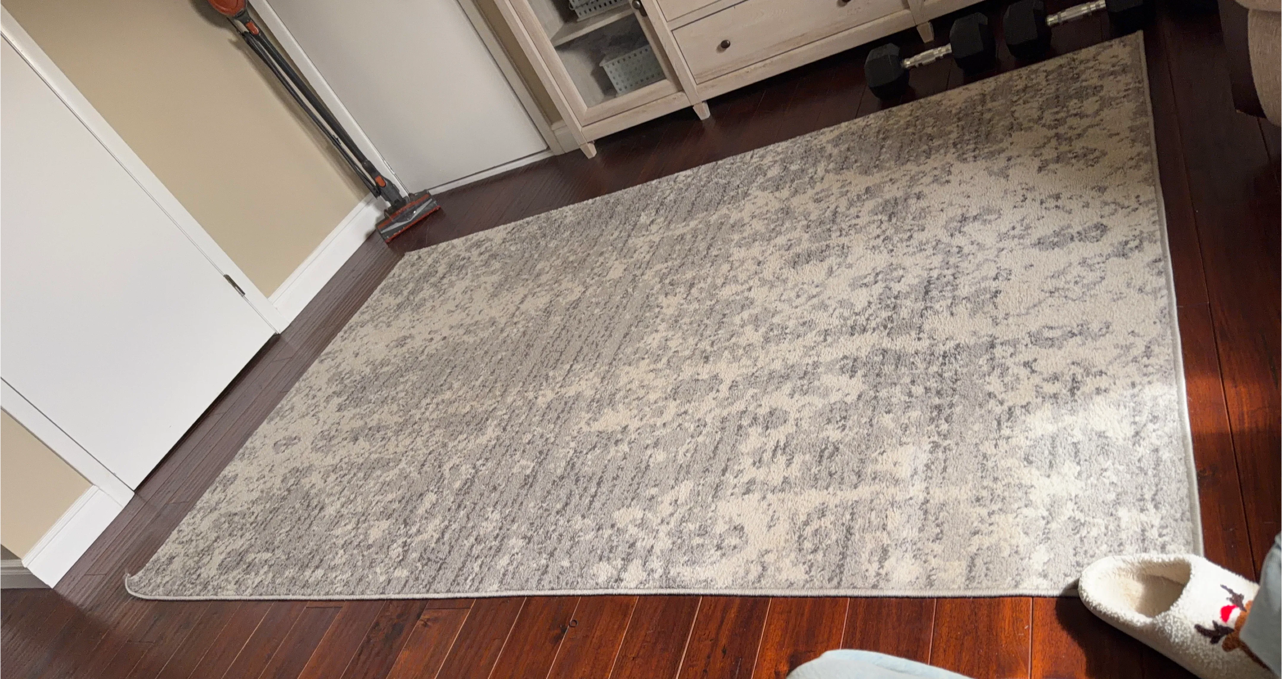 This area rug features a modern abstract pattern in shades of gray and cream. It's a nice addition to any room. The rug has a soft texture. It's perfect for living rooms or bedrooms!