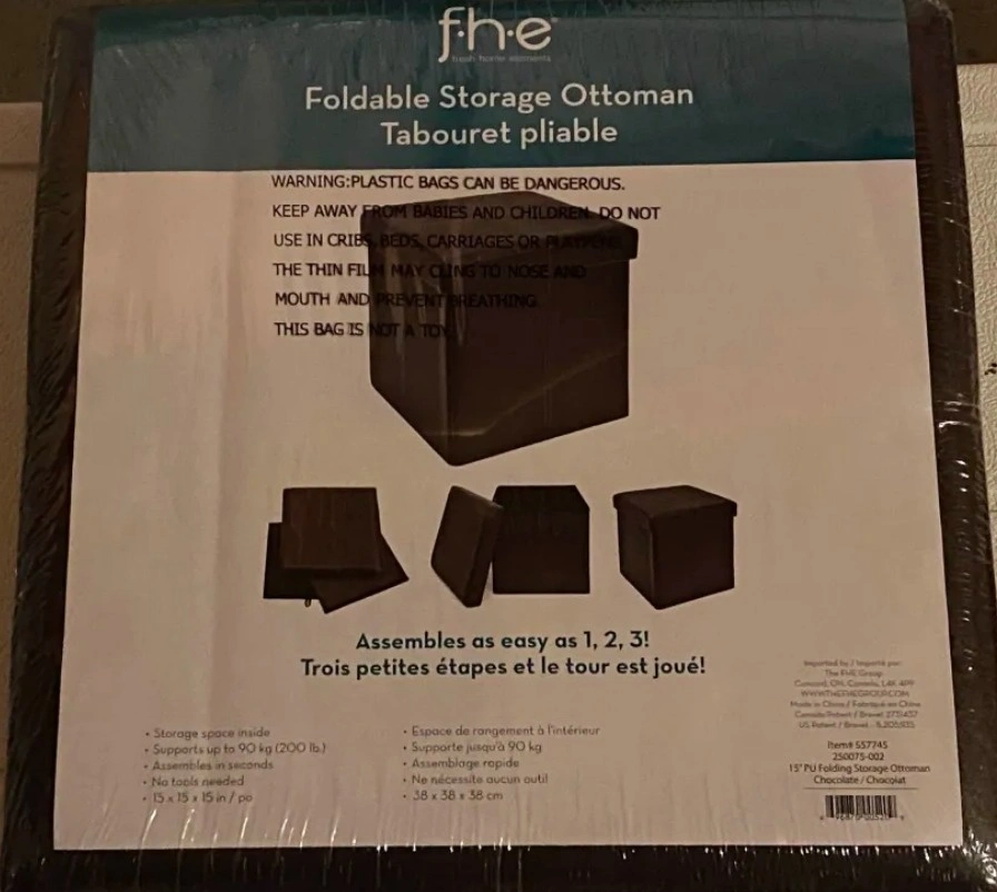 Brand new foldable storage ottoman, still in its original package and never opened. Dimensions are 15 x 15 x 15 inches. Made of faux leather.