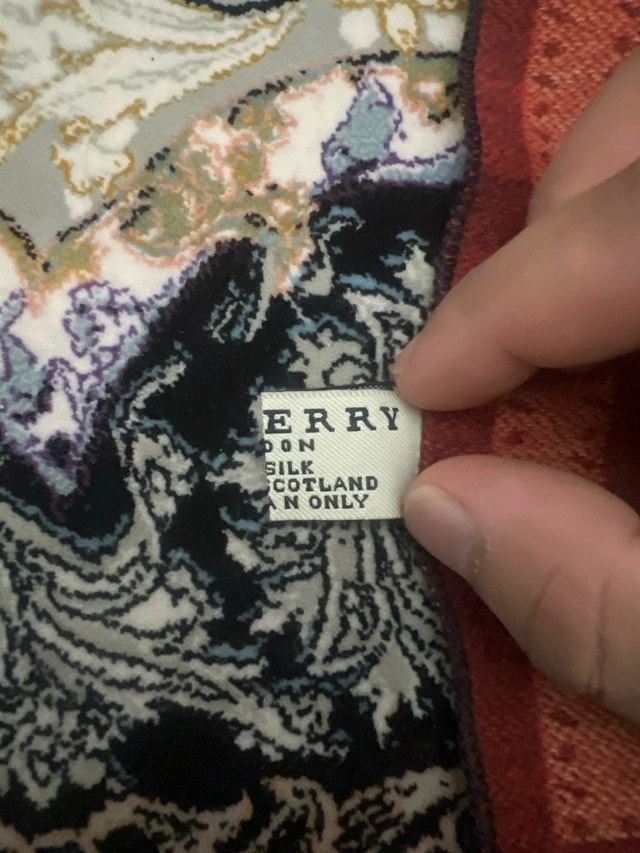 Luxury Burberry scarf, a timeless accessory showcasing the brand's iconic design. Made from 100% silk in Scotland, this scarf features the classic Burberry pattern and exudes elegance. * Material: 100% Silk * Origin: Made in Scotland * Design: Classic Burberry pattern If the ad is up, it's still available!