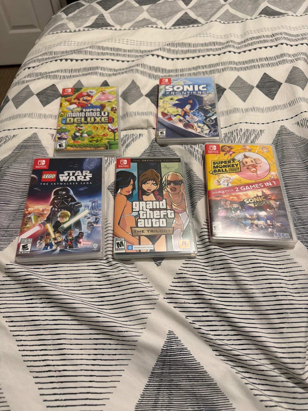 Bundle of five Nintendo Switch games including Super Mario Bros. U Deluxe, Sonic Frontiers, LEGO Star Wars: The Skywalker Saga, Grand Theft Auto: The Trilogy, and Super Monkey Ball Double Pack.