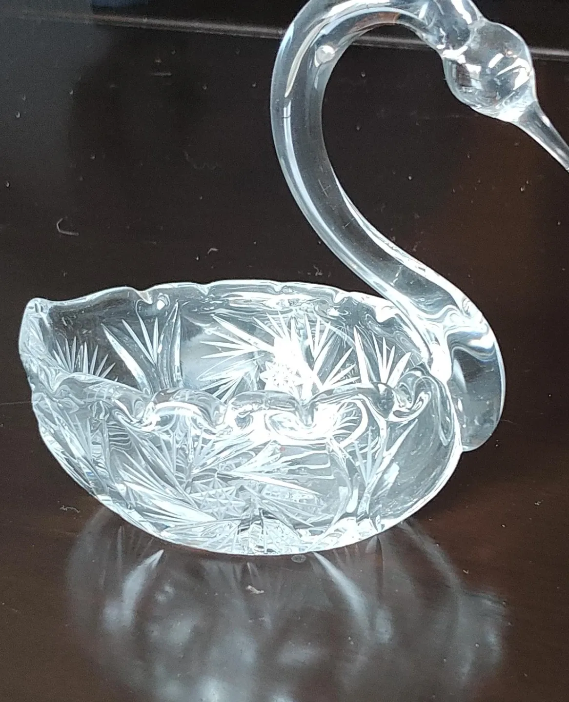 Clear crystal glass trinket dish shaped like a swan. It features detailed fan and starburst cut glass patterns. Perfect for holding small jewellery or decorative items.