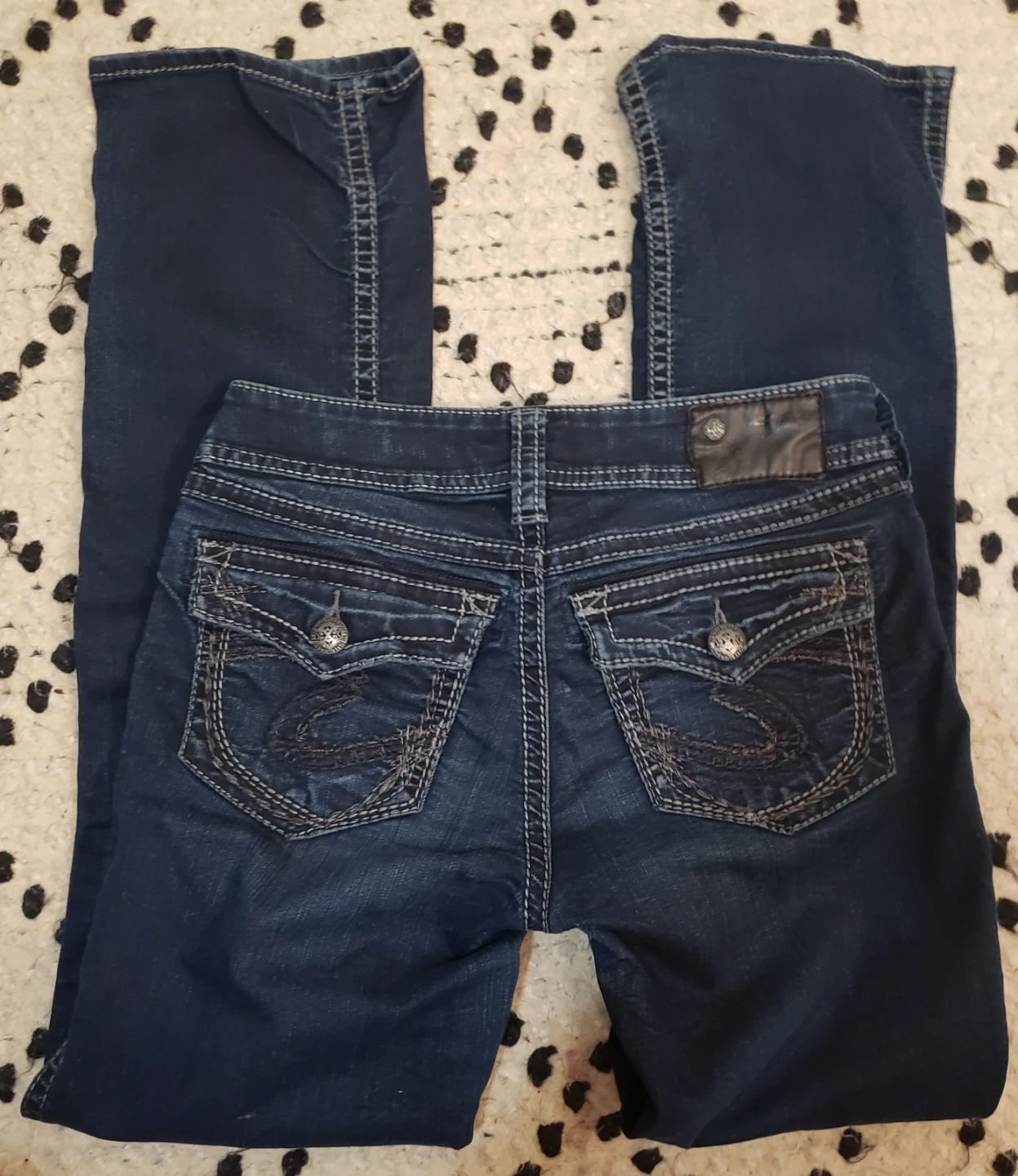 Selling a pair of Silver Jeans Co. bootcut jeans! They're a nice dark wash with detailed stitching on the pockets. These jeans are in great condition and ready for a new owner