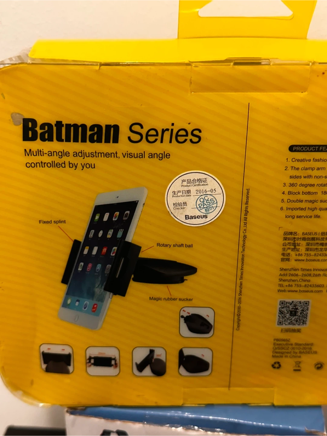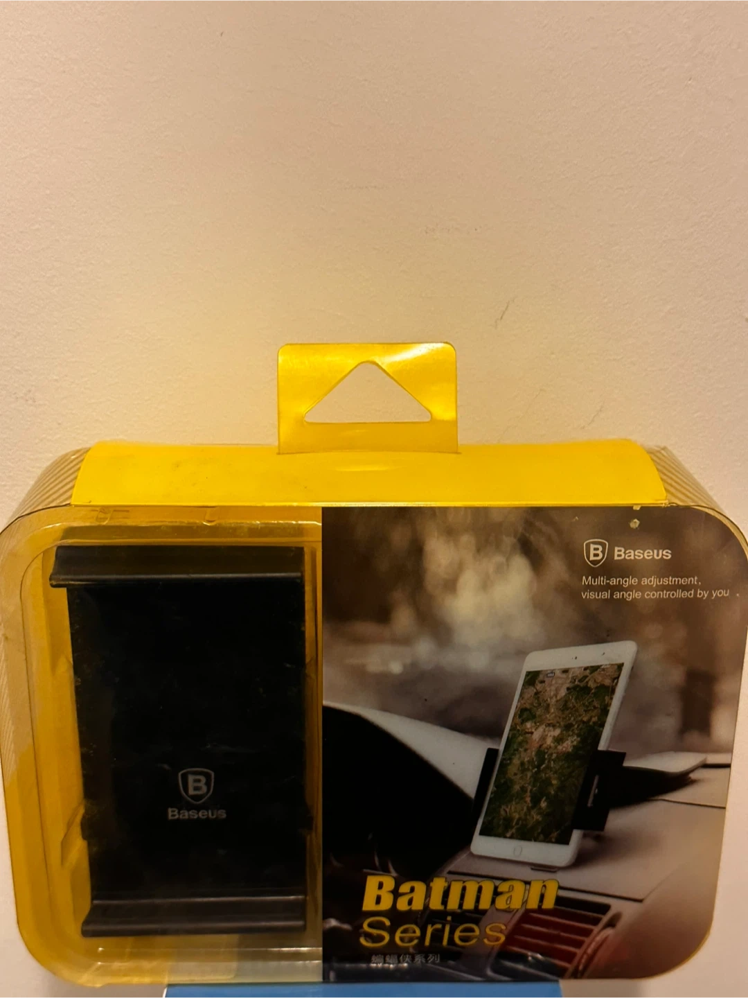This Baseus Batman Series holder offers multi-angle adjustment for your phone. It features a clamp arm and a magic rubber sucker for secure mounting. It's designed for convenient visual angle control while driving. It’s brand new in box . Original price was $ 69 . It can hold small tablet and phone