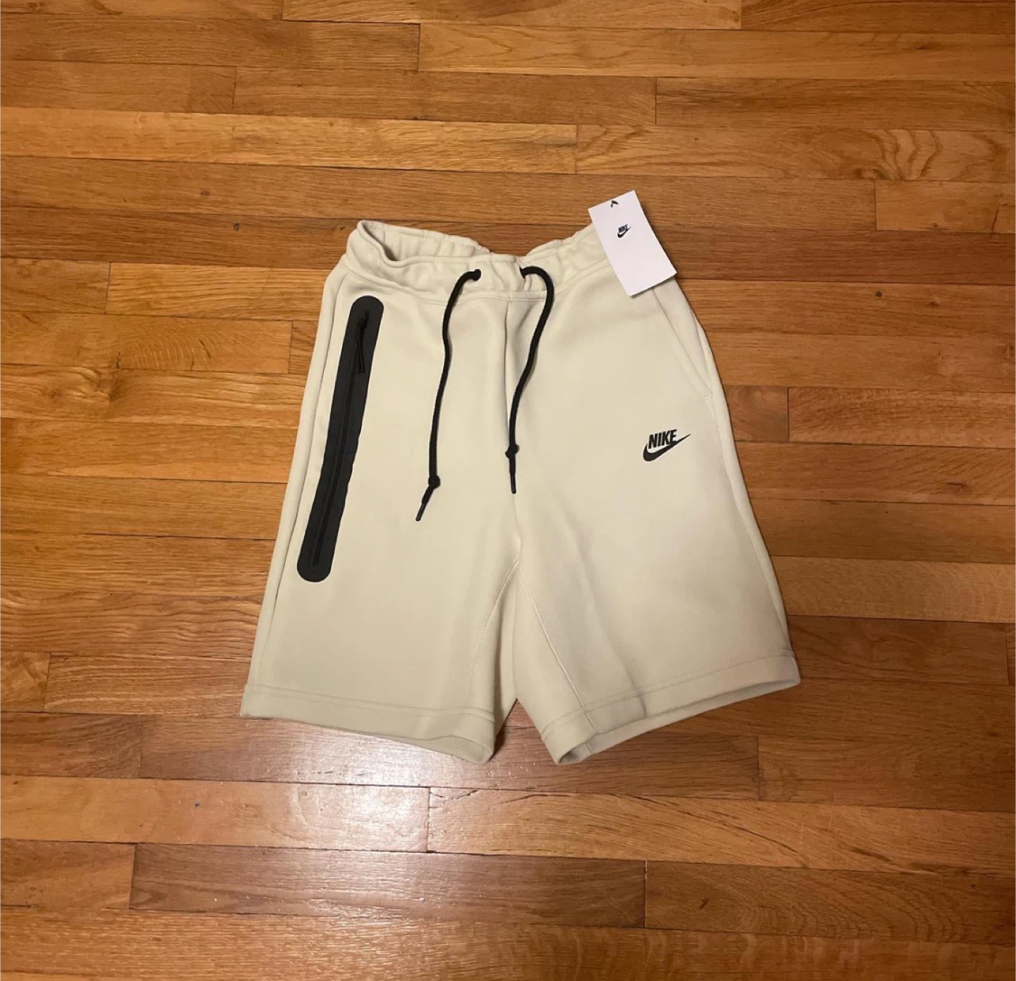 Nike Tech Fleece shorts in XS size. Features a zip pocket on the left side and a drawstring waist. Made in Vietnam. Cotton and polyester blend.
