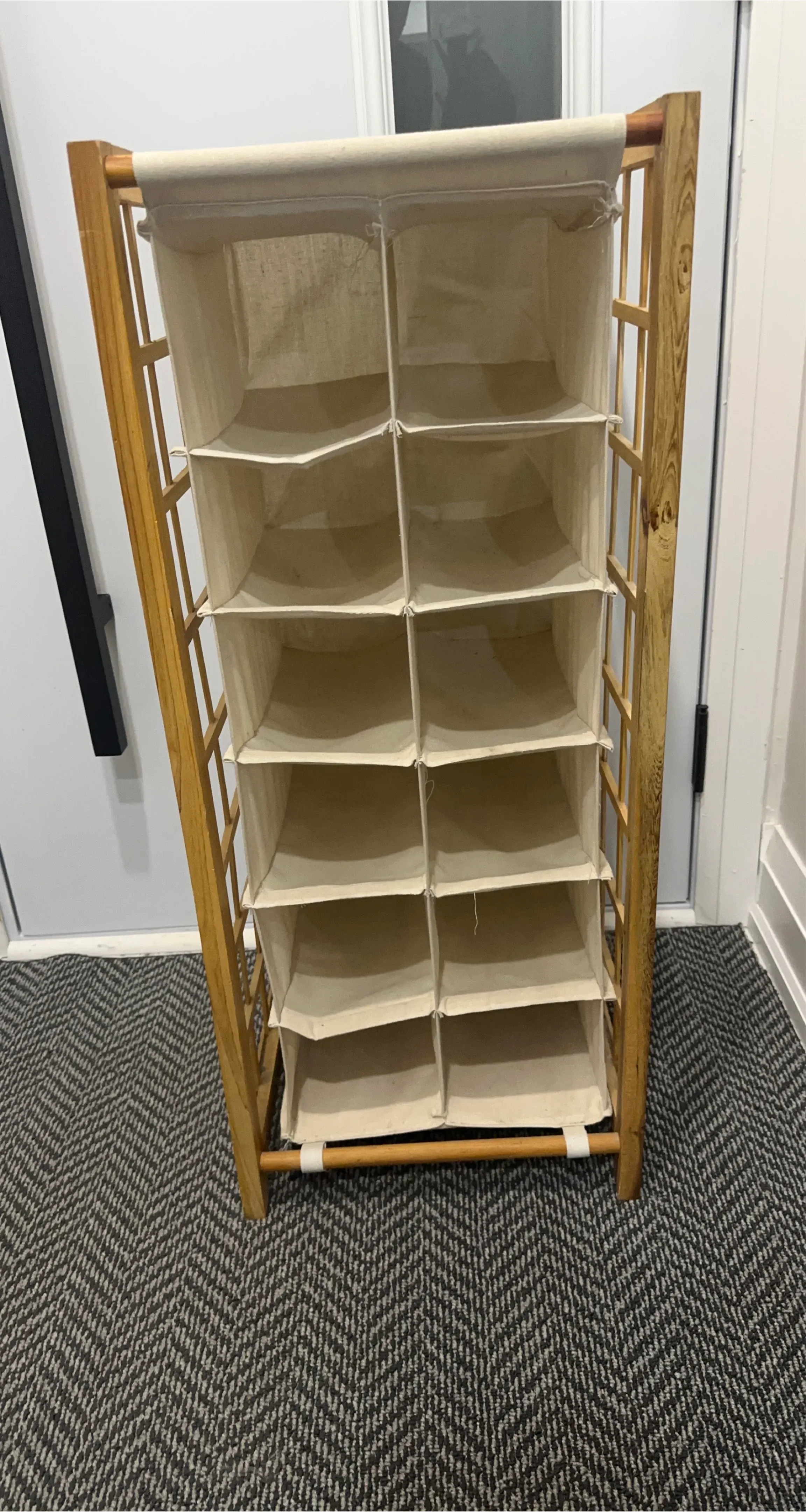 This is a handy shoe rack with a wooden frame and 10 fabric compartments. It's perfect for keeping your footwear organized by the door. The fabric shelves are a natural beige colour.