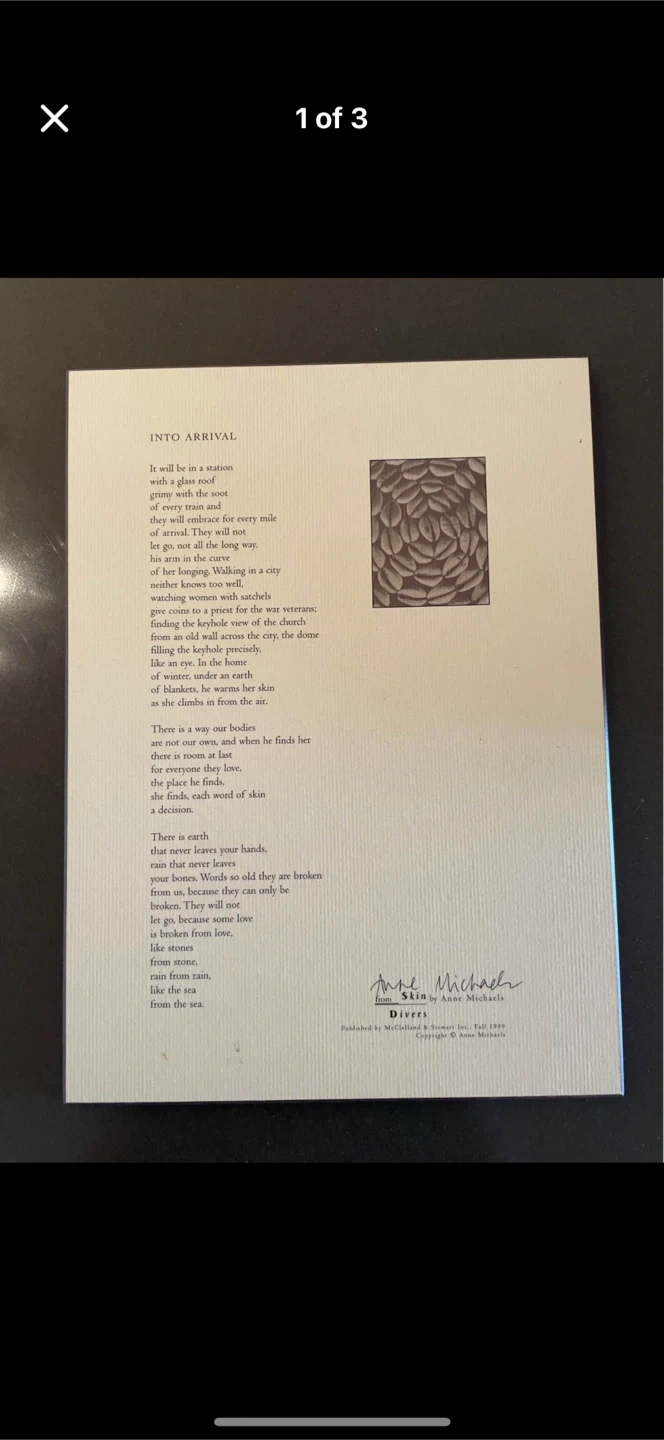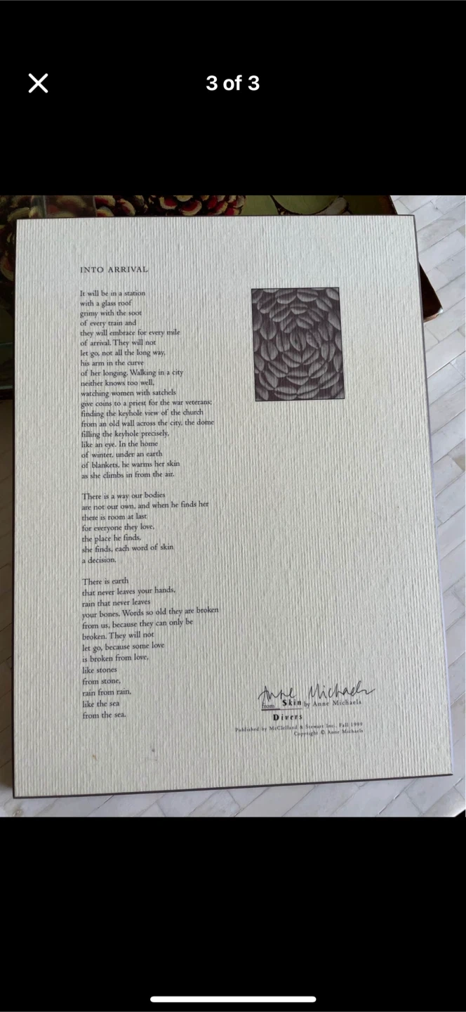 This is a print of the poem 'Skin Divers' by Anne Michaels signed by the author before dry mounting