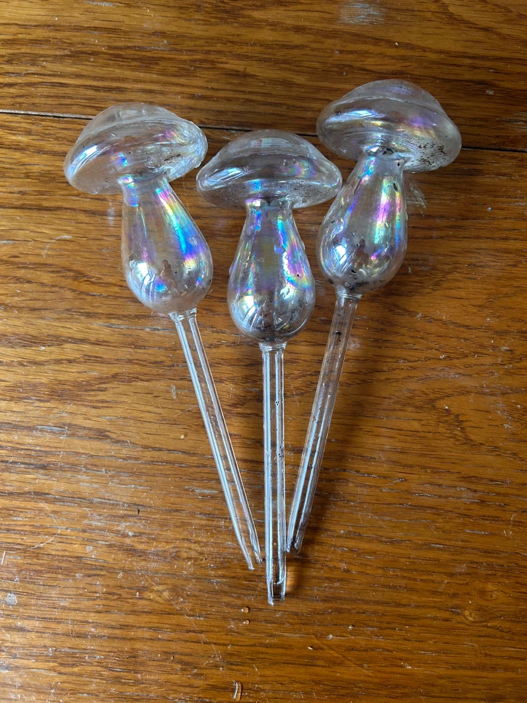 Water your plants with these cuuuuute mushroom-shaped glass waterers. They're made of iridescent glass and are designed to be filled with water and inserted into the soil. This set includes three waterers.