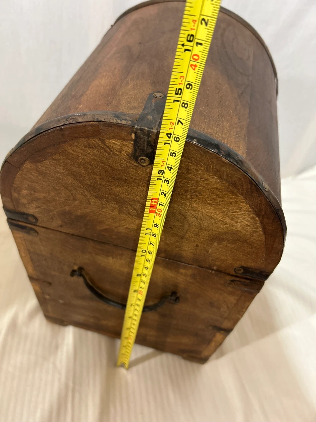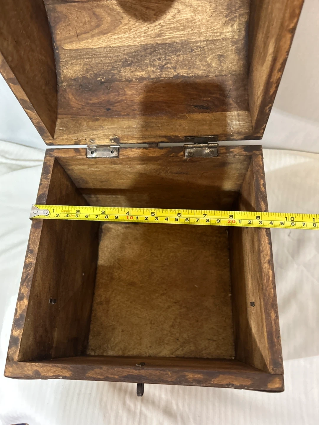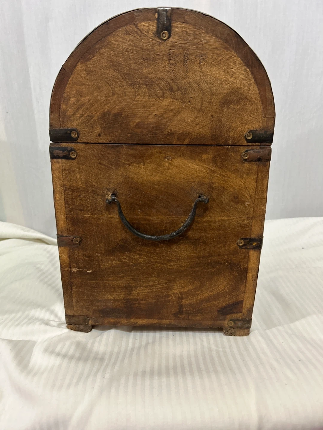 This decorative chest is made of wood with metal accents. It measures approximately 9 inches wide and 14 inches high. Its rustic design makes it a charming addition for storage or display. Two available. $25 each.