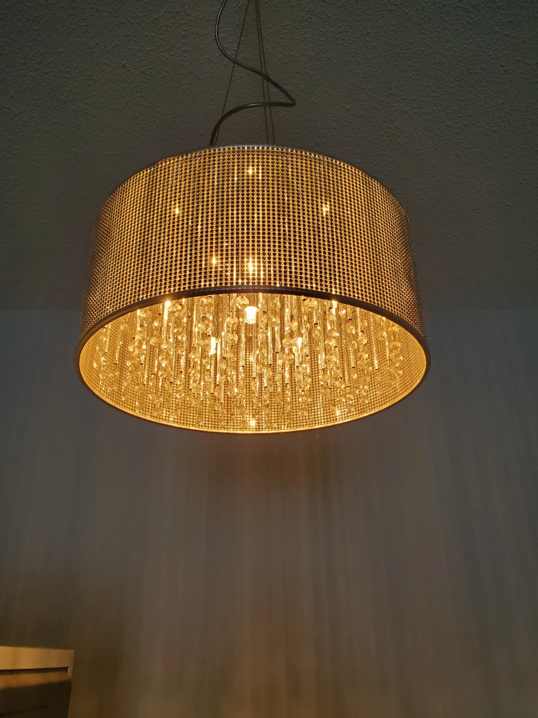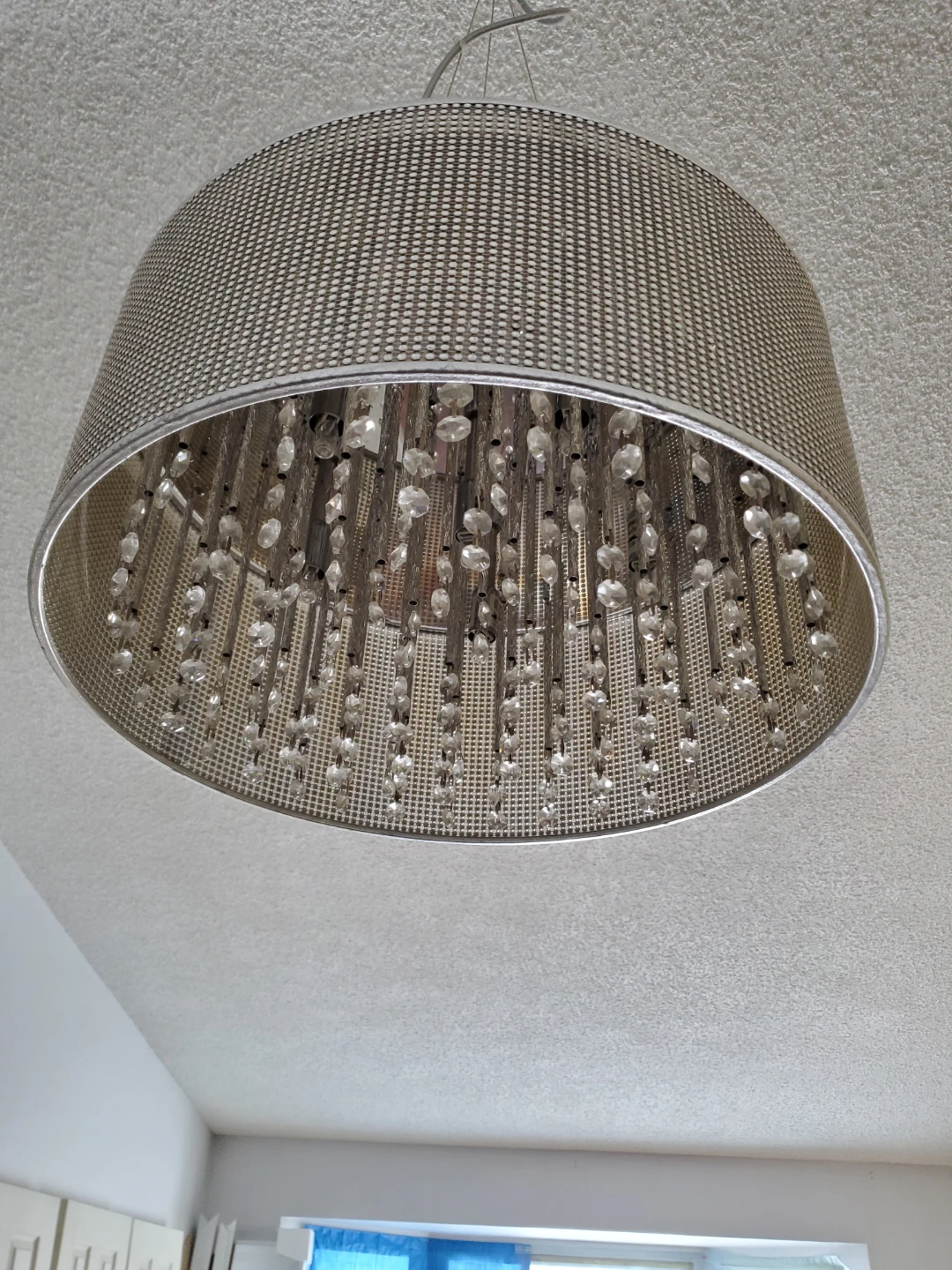 This stylish drum chandelier features a silver-toned metallic mesh shade with intricate crystal droplet accents. It hangs from a metal cord and provides a warm, inviting light. Perfect for adding a touch of glamour to any room! Rim is 8" tall, diameter is 17". Overall hanging height is variable depending on your preferences.