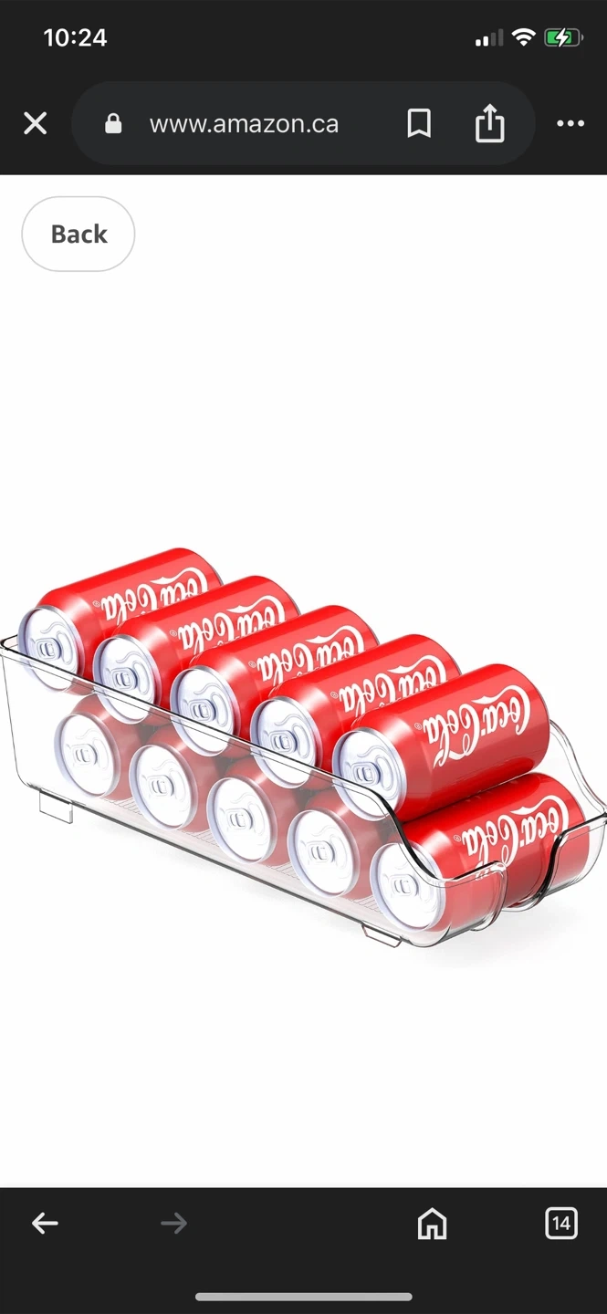 This clear plastic organizer holds up to 10 standard-sized cans, like soda or La Croix. It's made from durable plastic and keeps your fridge or pantry tidy. Perfect for use in kitchens or small apartments!