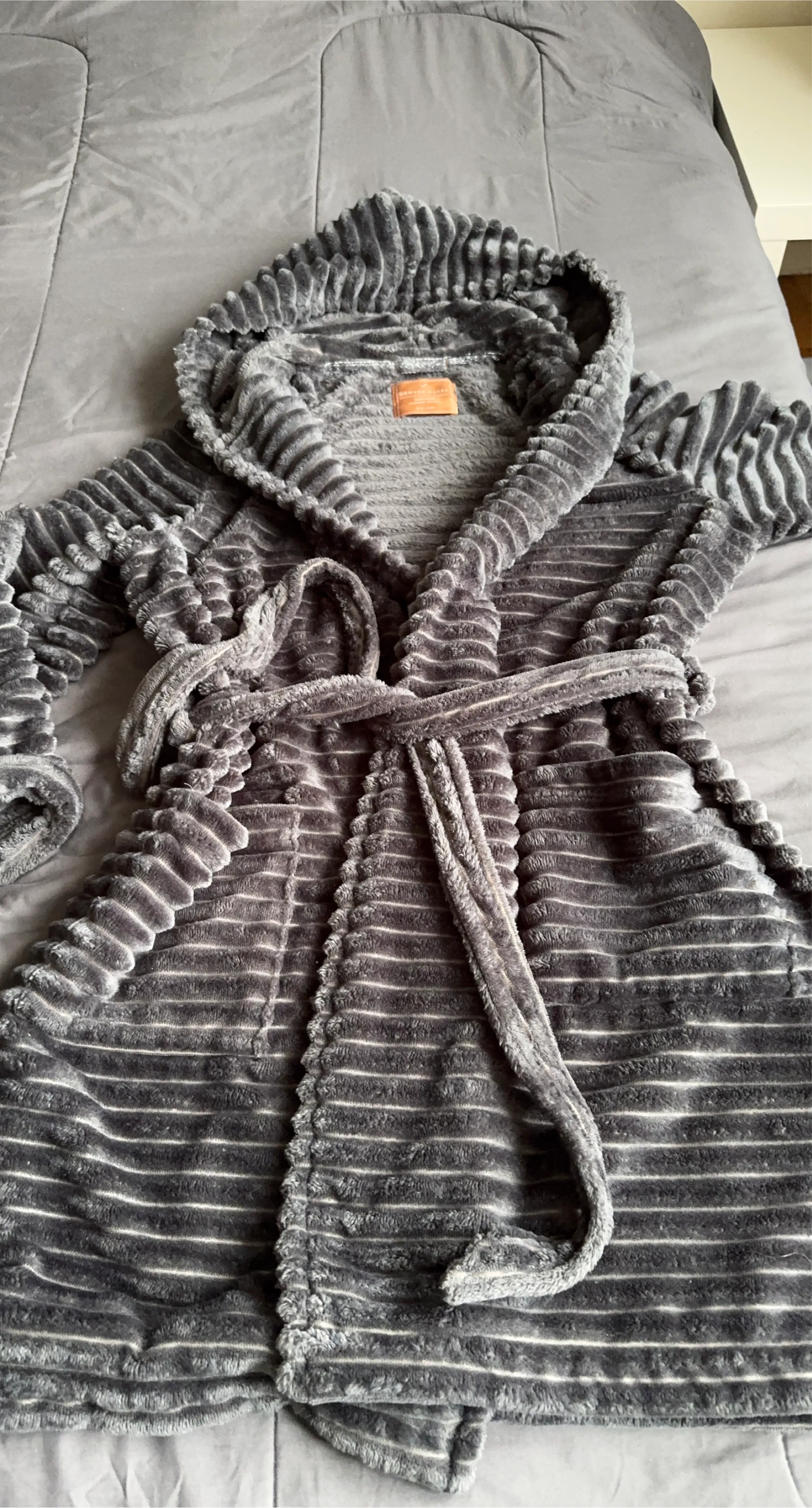 Super soft and cozy hooded robe with a classic grey stripe pattern. It features a tie waist for a comfortable fit. Perfect for lounging around the house or after a bath!