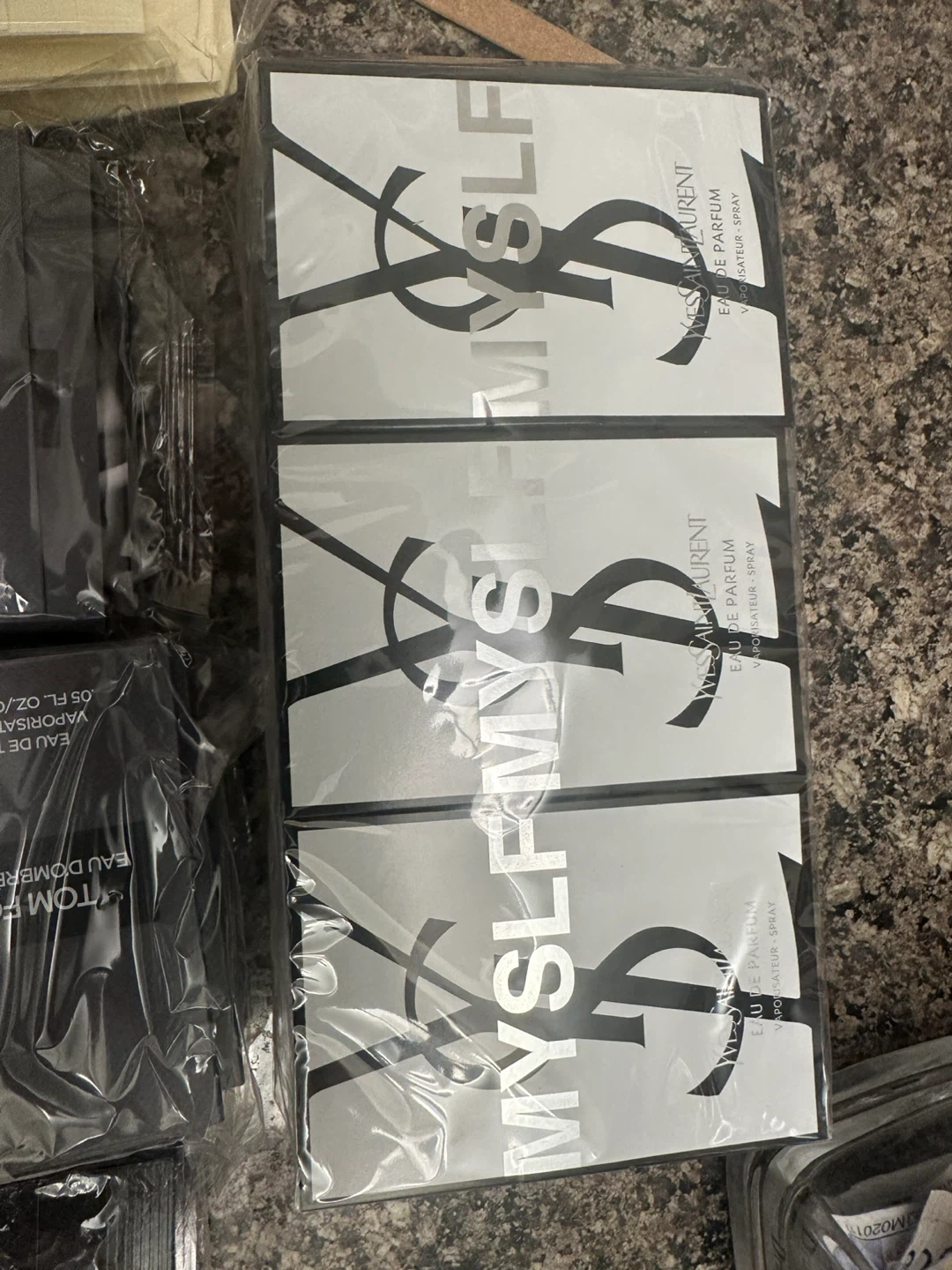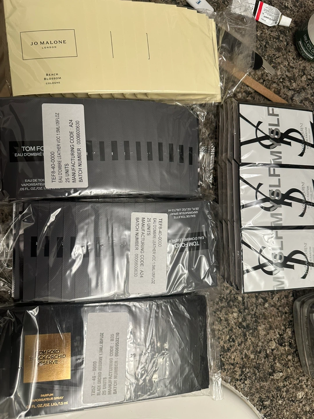 Selling assorted perfume samplers including Tom Ford Eau de Libre Leather, Tom Ford Black Orchid Reserve, Yves Saint Laurent MYSLF, and Jo Malone Beach Blossom Cologne. All are new and individually packaged. 25 pic per bag is 50$.