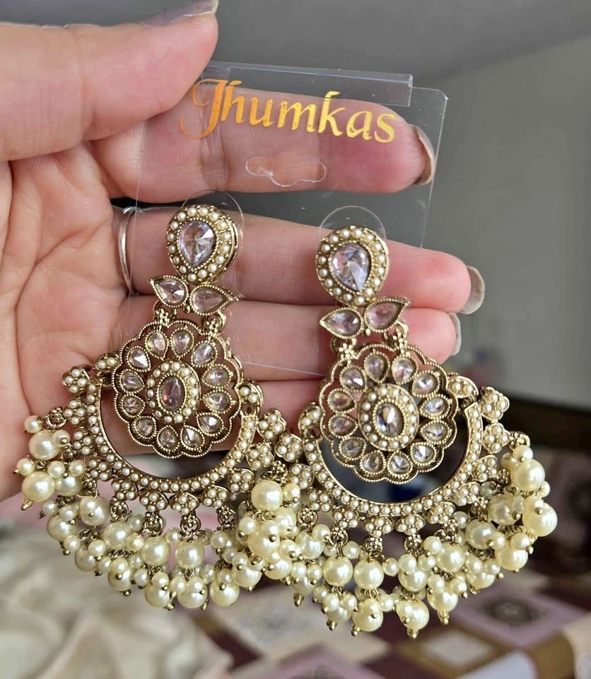 Elegant Jhumkas earrings featuring clear stones and pearl drops, presented in their original packaging, brand new and unused.