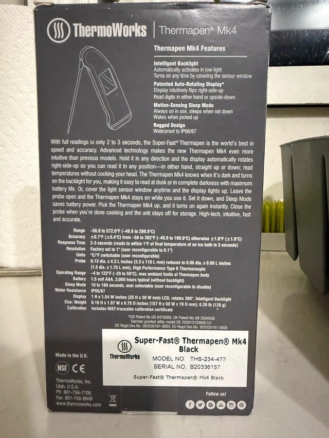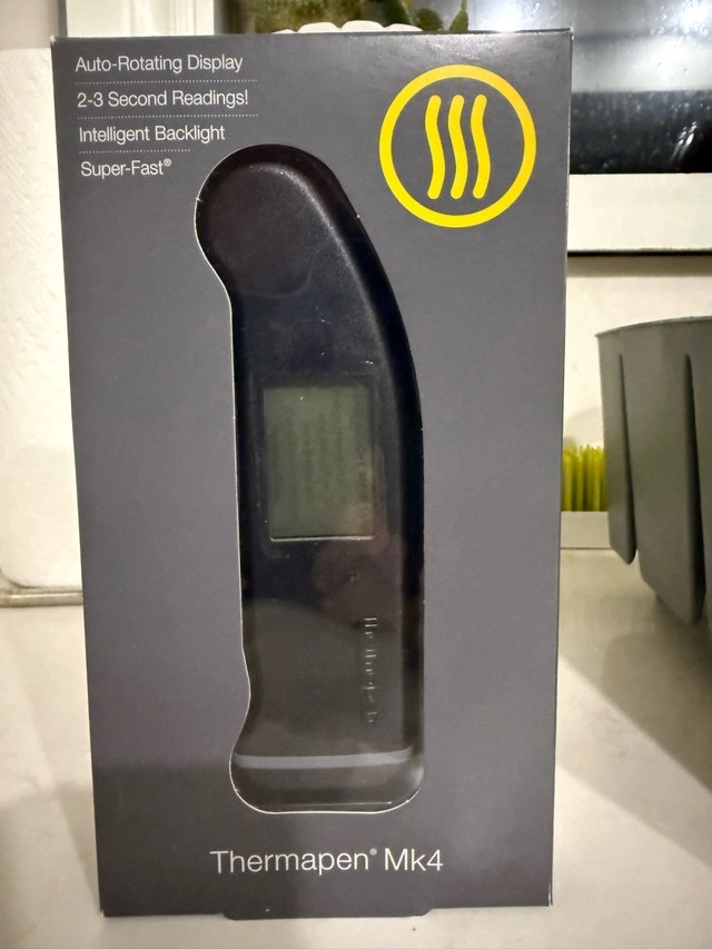 I'm selling a new ThermoWorks Thermapen Mk4, the gold standard in digital thermometers! This Super-Fast thermometer provides accurate readings in 2-3 seconds with its intelligent backlight and auto-rotating display, making it perfect for any cooking enthusiast. Specifications: Range: -58.0 to 572.0°F (-49.9 to 299.9°C) Response Time: 2-3 seconds Resolution: Factory set to 1° (user reconfigurable to 0.1°) Display: LCD, rotates 360°, Intelligent Backlight. This thermometer is a must-have for any kitchen, ensuring perfectly cooked meals every time. If the ad is still up, rest assured, the item is available! Cash accepted. Cashless payment accepted.