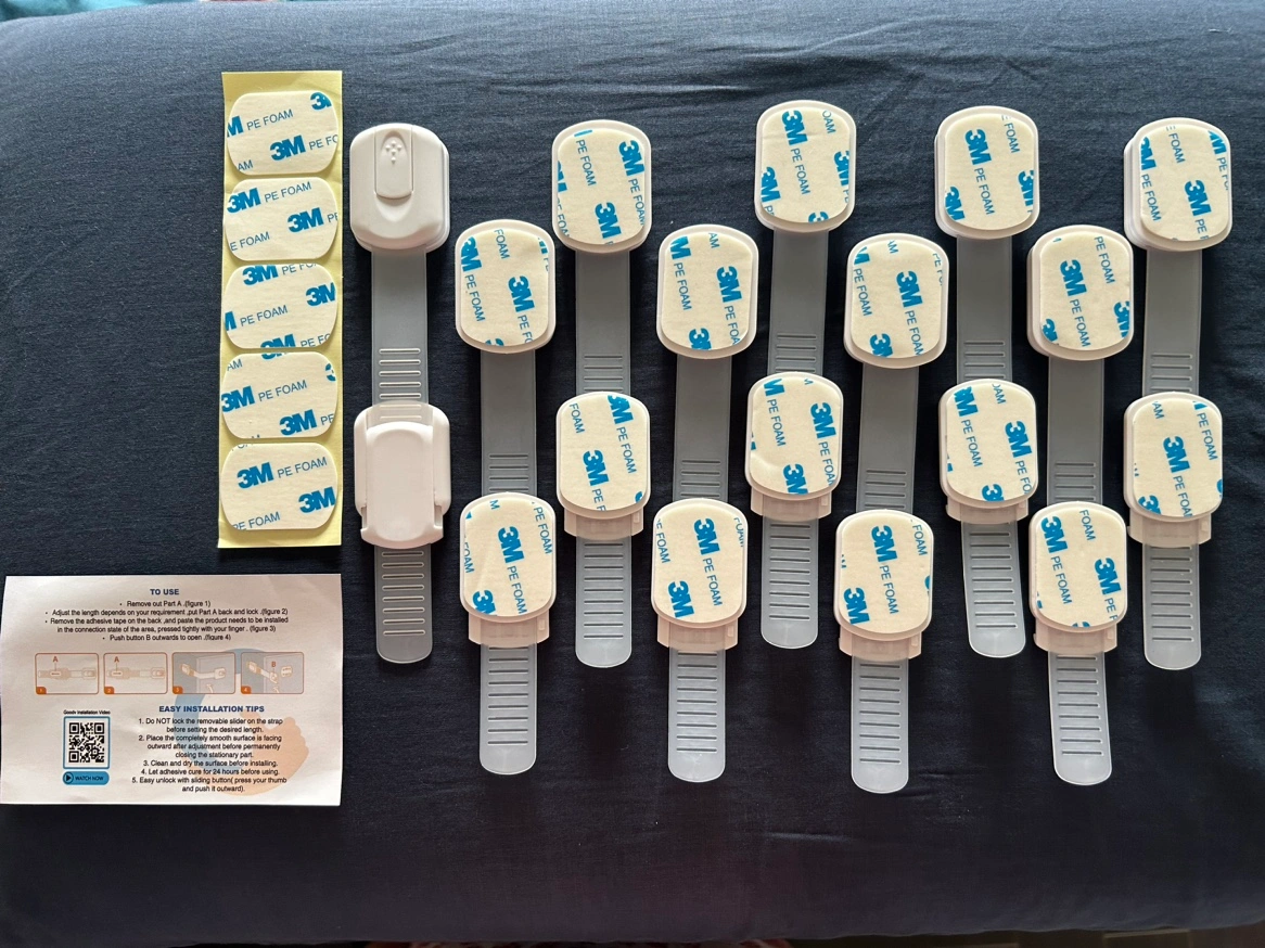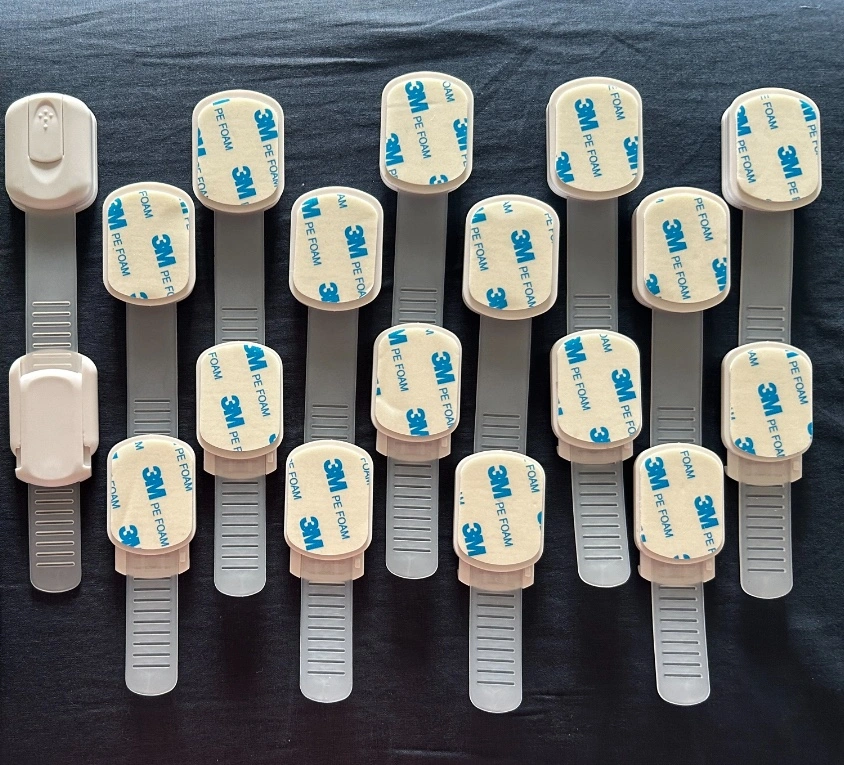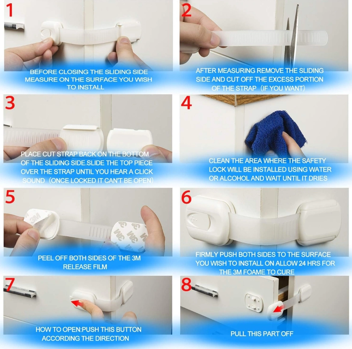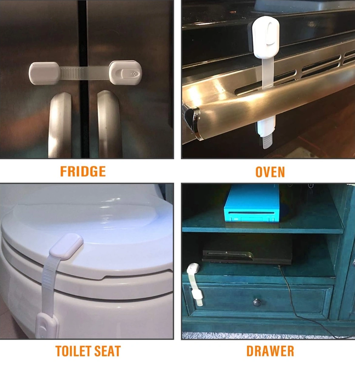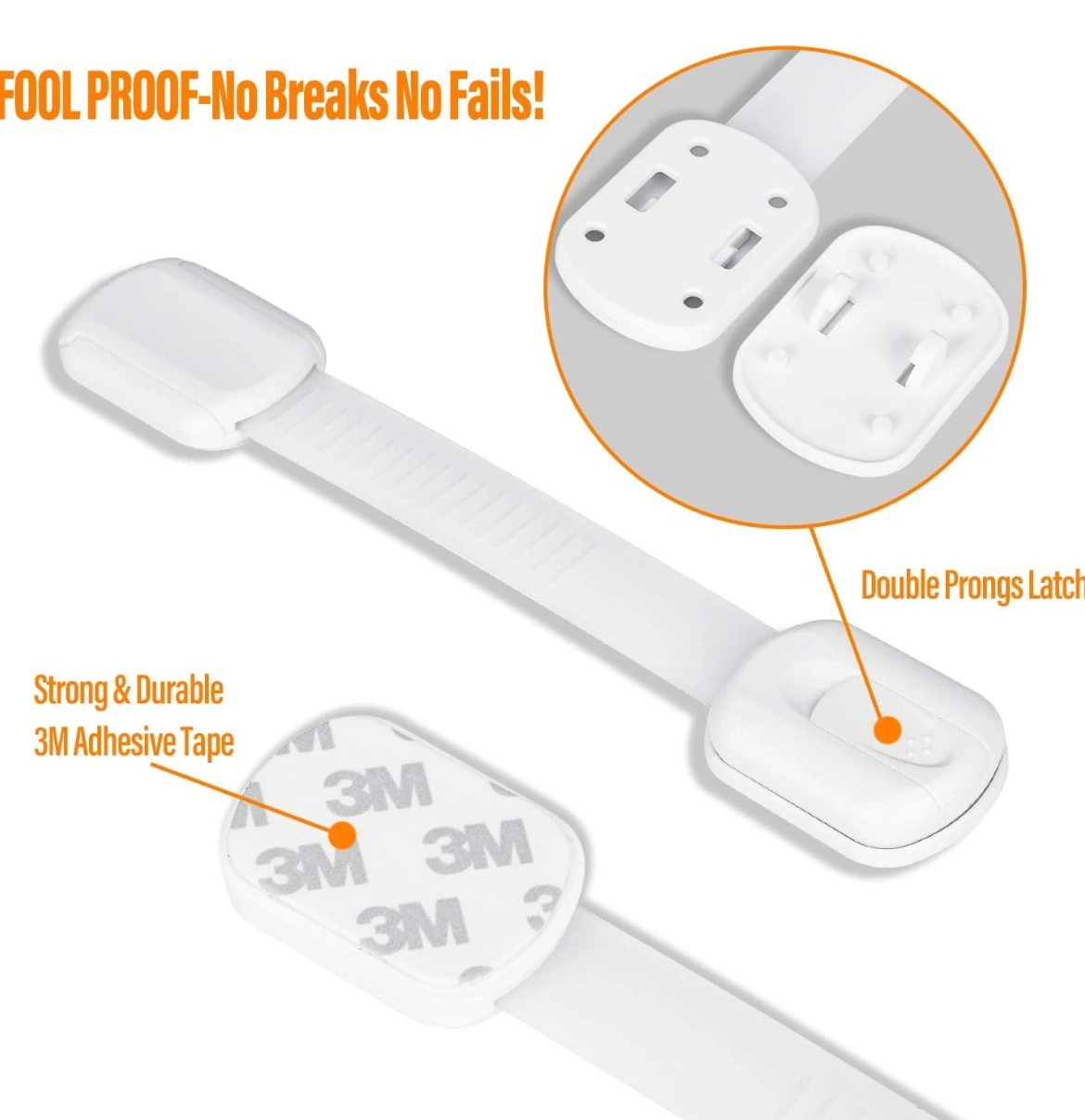 - Baby proofing latches to drawer door, fridge, oven, kitchen cupboard, trash can, toilet seat with strong 3M adhesive