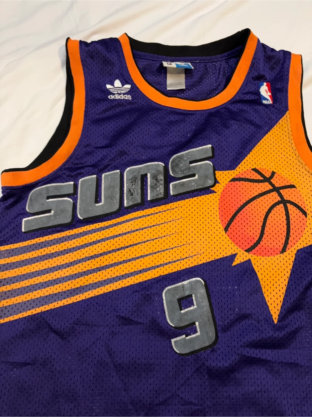 Vintage Adidas Phoenix Suns Hardwood Classics Jersey #9 - Size L. Please note the letters used to be white. Due to age it peeled off during wash. $40 cash, porch pick up Kennedy and Eglinton.